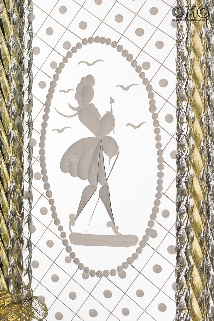 Engraving with sandstone by hand. Decorated with “Rigadin reeds” (crystal and gold). Crystal leaves and rosettes (flowers) with gold 24 carats leaf, or in glass paste.