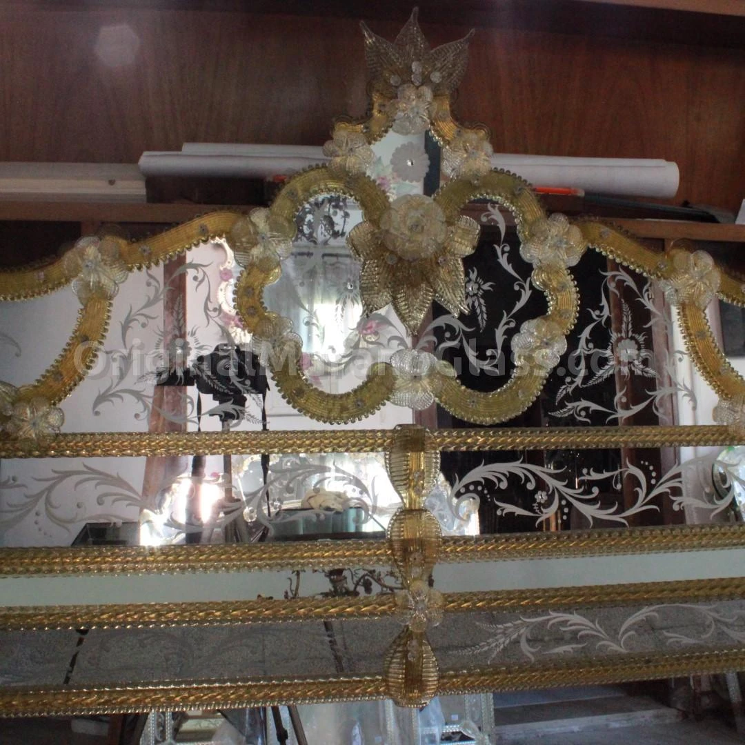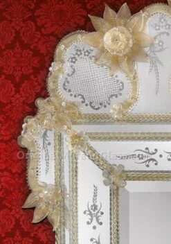 The mirror consists of 20 flowers and canes curls, with glass fused with 24kt gold, and wooden frame.