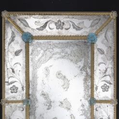 The mirror consists of 28 flowers and canes curls, with glass fused with 24kt gold, and wooden frame.