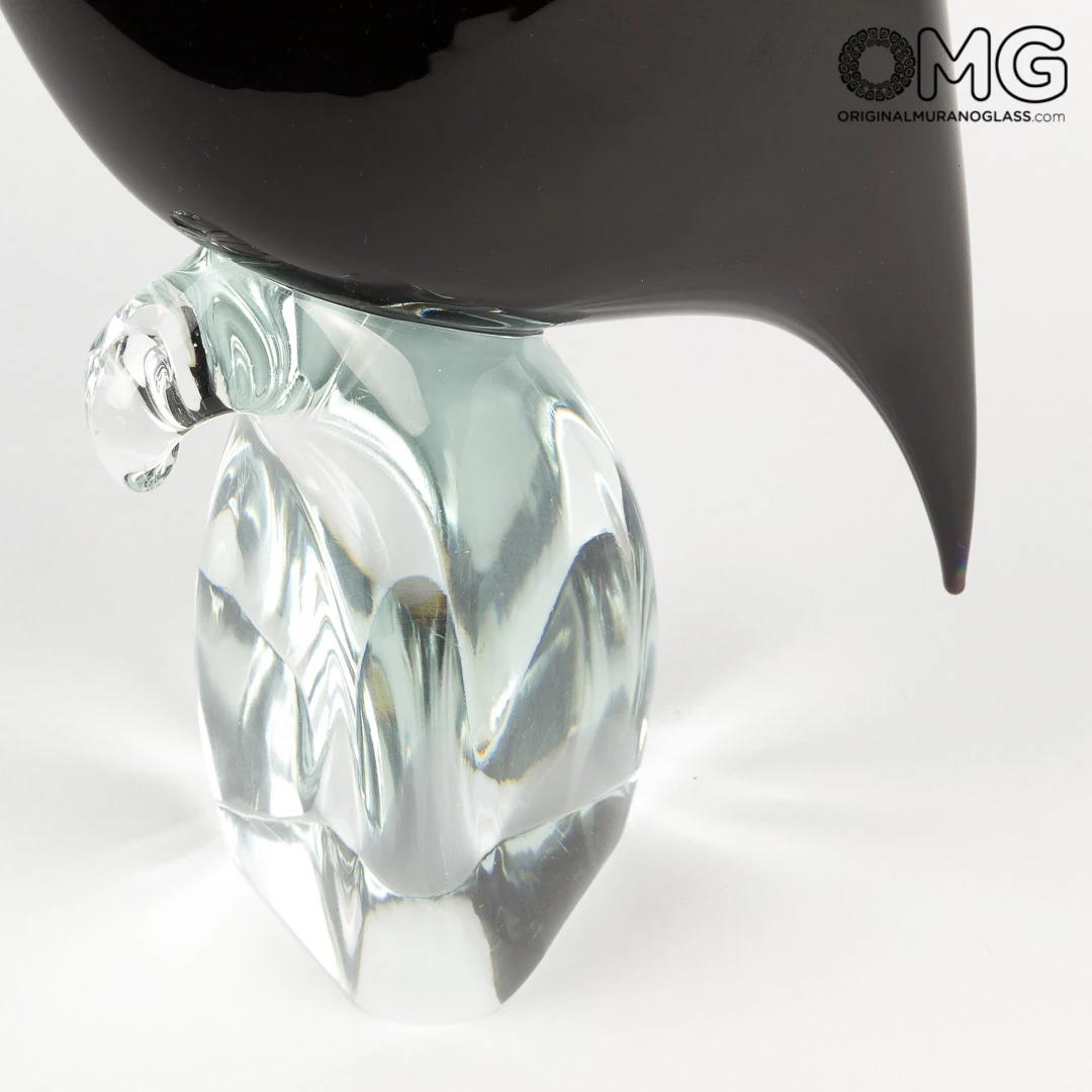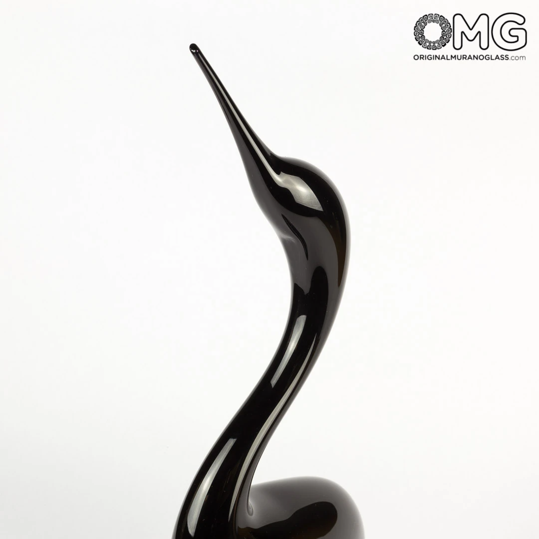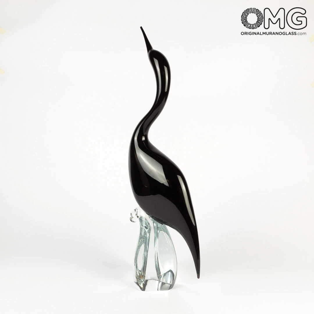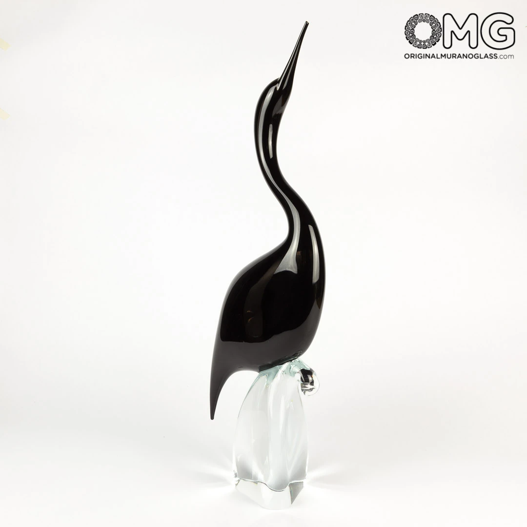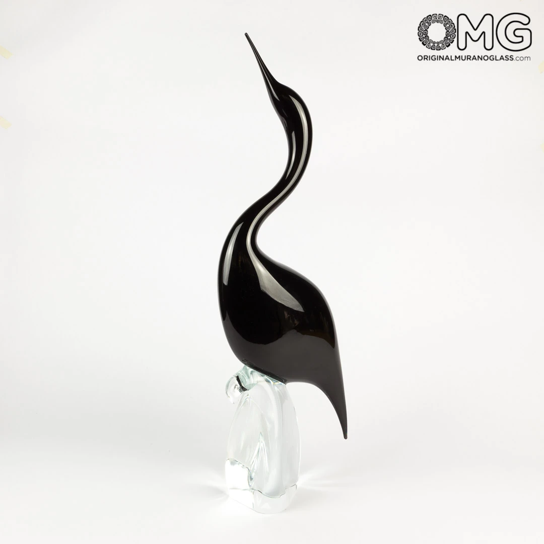 Sinuous sculpture of heron in black on crystal base, worked free hand on a punty in solid glass with the glass working techniques in Murano. This lovely sculpture, extremelly elegant, is the perfect artwork for a luxury shelf or to complete your rich furniture. You can put it under the light of a lamp, on the table or near a plant. Wherever you locate it, this elegant sculpture will gift you all its charm.