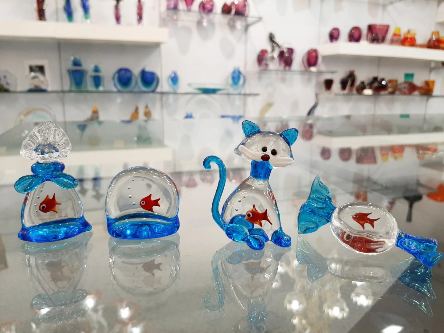 Beautiful aquarium glass sculpture, made with “sommerso” technique. This art work is handmade with a very difficult technique: first the glass master makes the little fishes and after he melts them into a glass stone at high temperature.