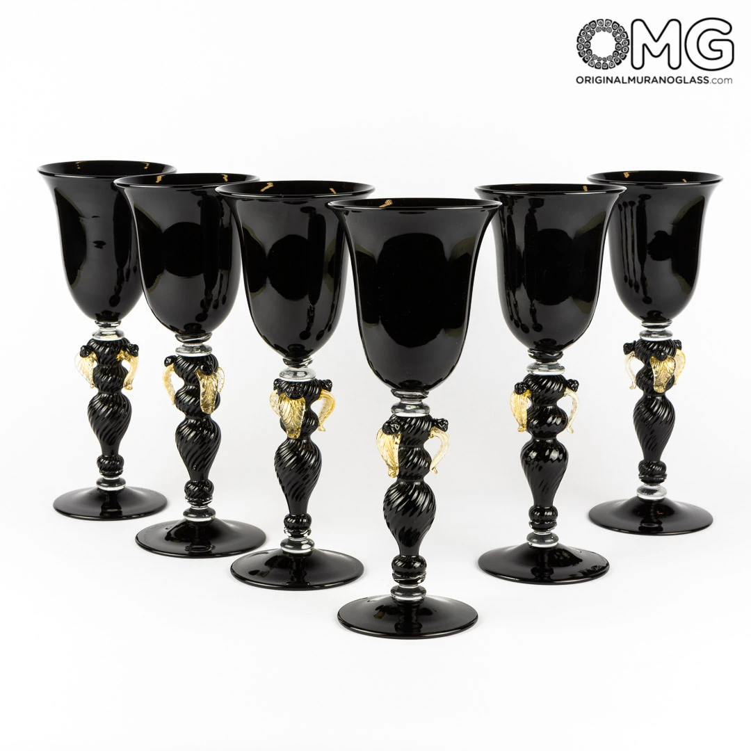 Very nice set of flute glasses. All items are handmade with glass and gold leaft 24kt. Made by blown glass technique. Elegant and preciose artworks pieces. Not stamp, but each Champagne Flute of this collection is an unique piece handmade. A new line of Champagne flutes inspired by baroque art years but revisited in a new style.