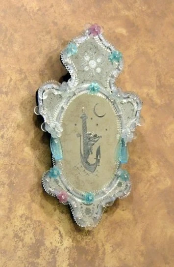 Small mirror wall, hand-engraved with a wheel made of sandstone, and antique frame decorated with curly transparent glass ( in purple ), 6 colored glass paste flowers and 5 flowers in clear glass and colored gold. Venetian mirror, handcrafted, made in Murano.