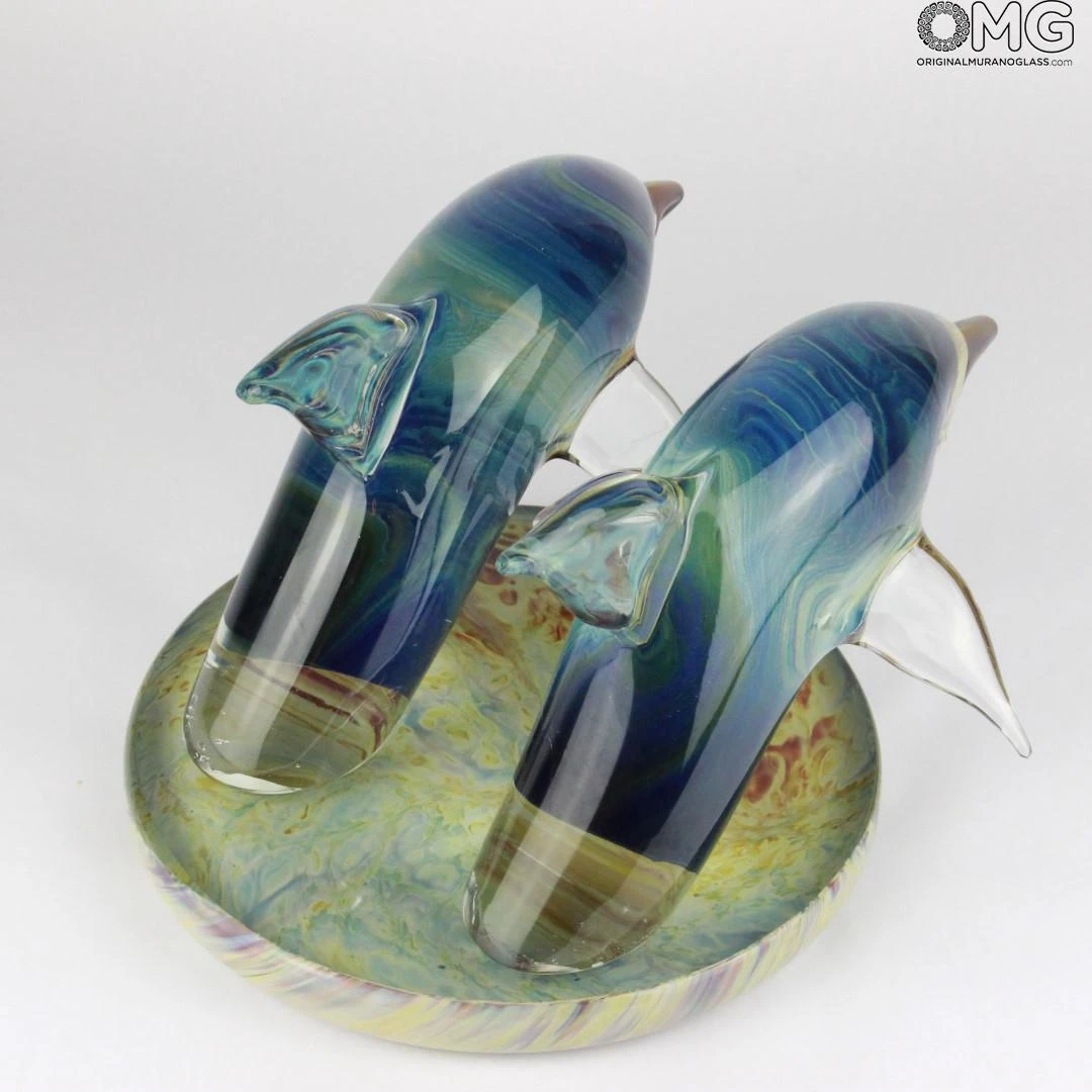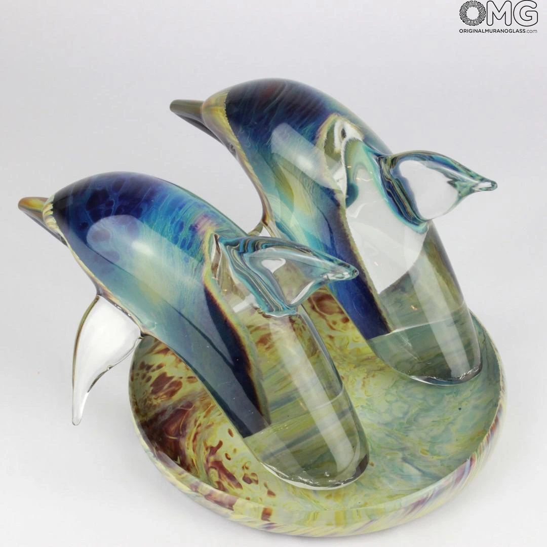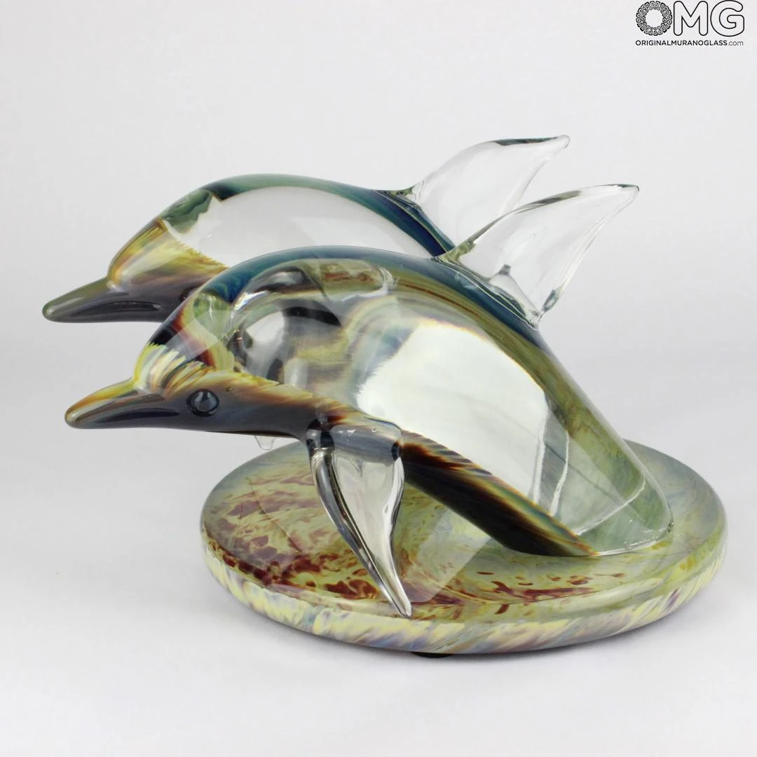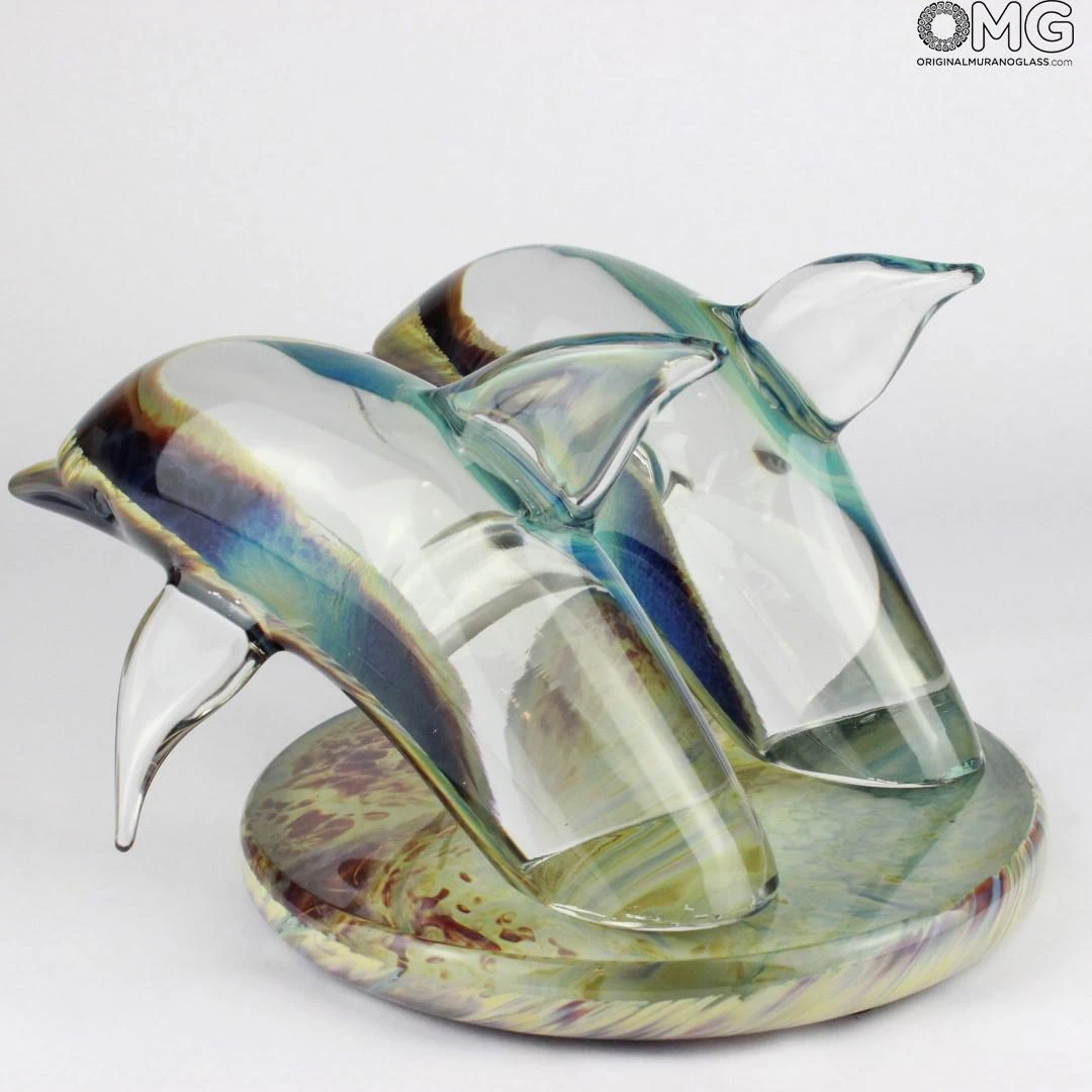 Exclusive and unique glass artwork of a dolphins handmade in clear glass and , realized in free hand on a punty in solid glass. The sculpture is polished and cold glass cut by sandstone.