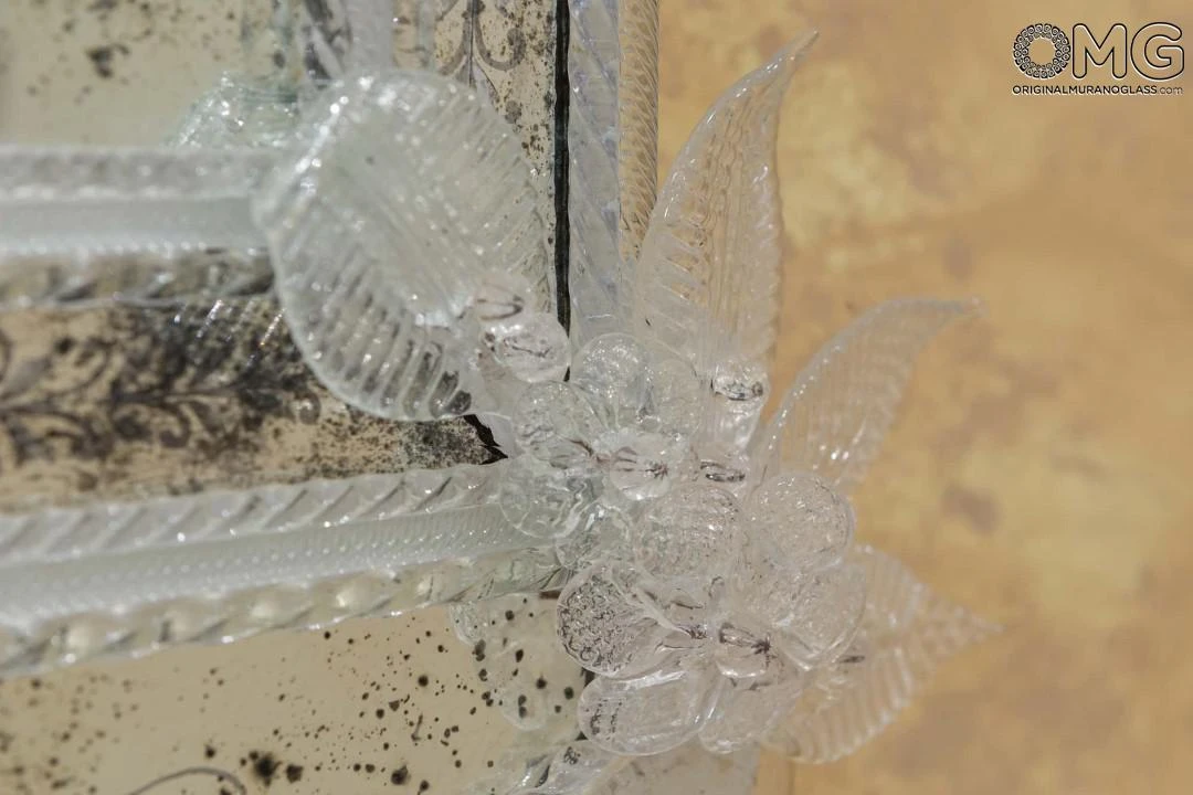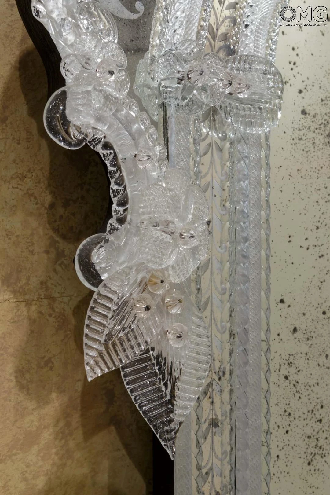 The mirror consists of flowers and canes curls, with glass fused with clear crystall glass and wooden framedecrated.