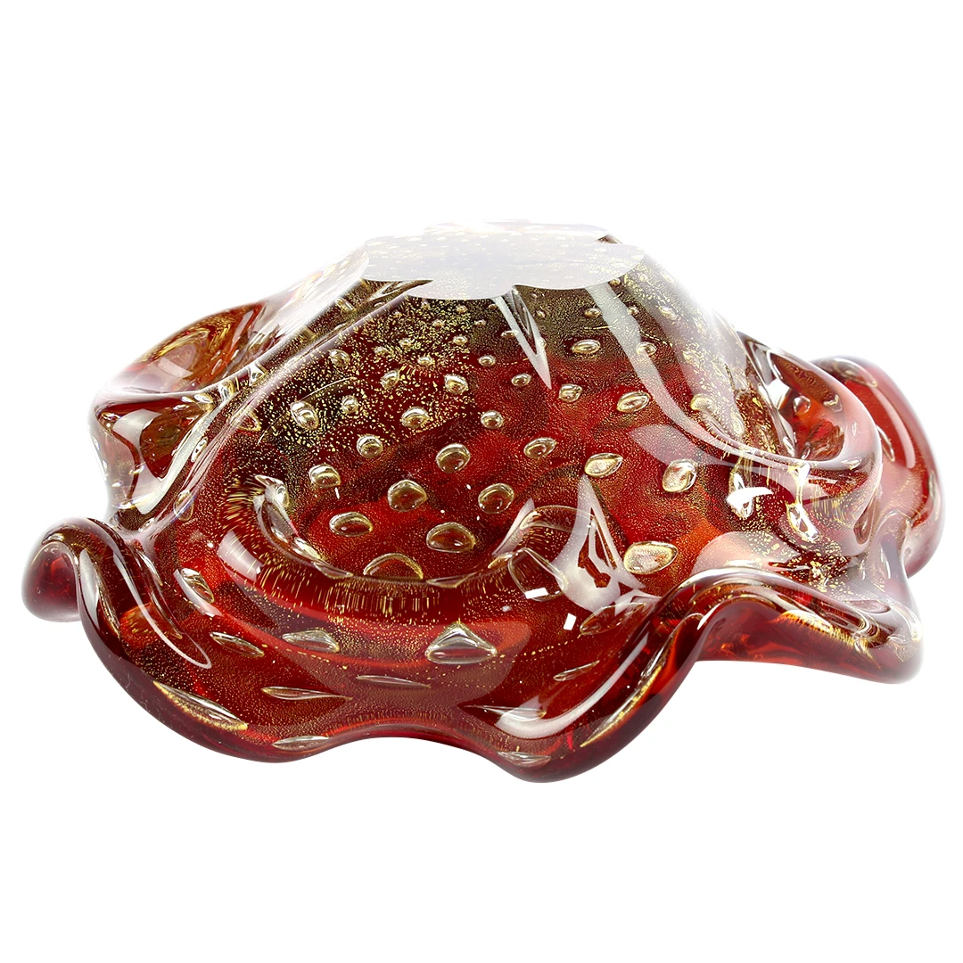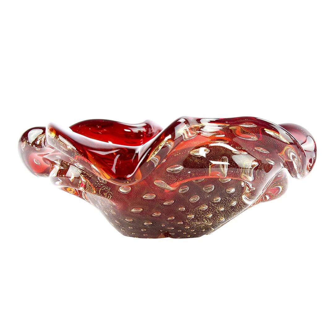 Beautiful mid-size ashtray from 60’s Italy style. The colorless glass was blown together with the red glass (sommerso)and pure gold 24kt.