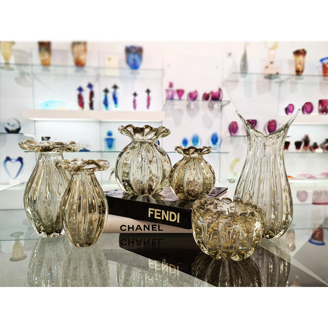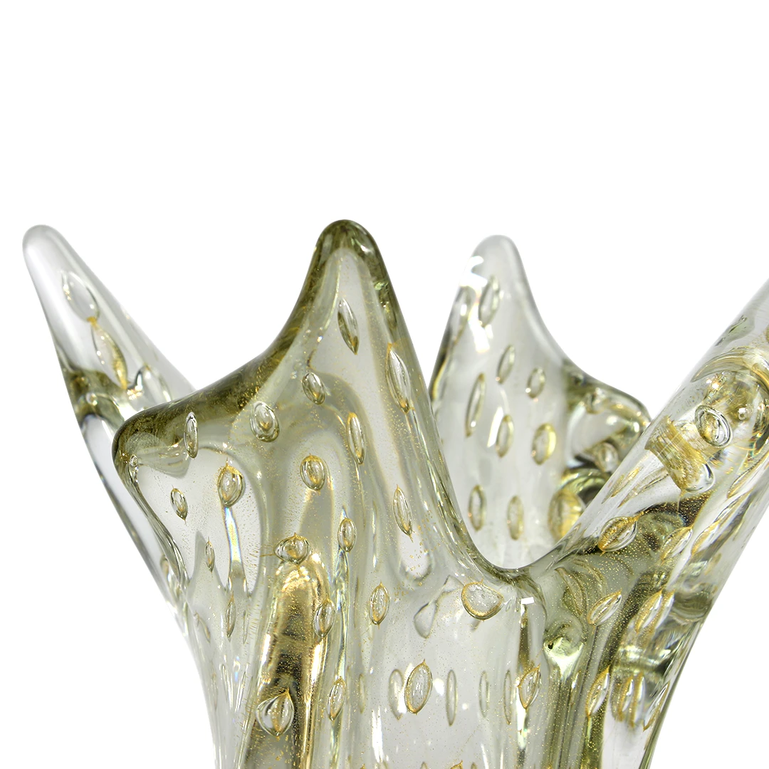 The folded glass bowl has a flower artist design with a vibrant grey color and pure gold 24kt. The amazing controlled pattern of bubbles was achieved by the bullicante bubbled technique .