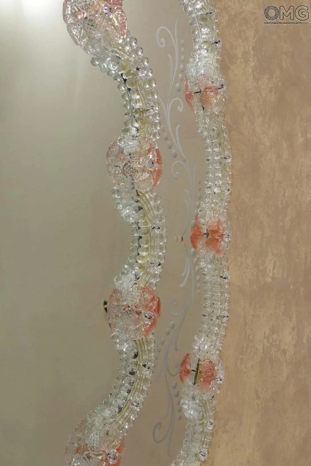 The mirror consists of flowers and canes curls, with glass fused with clear glass, flowers in pink and wooden framedecrated in gold.