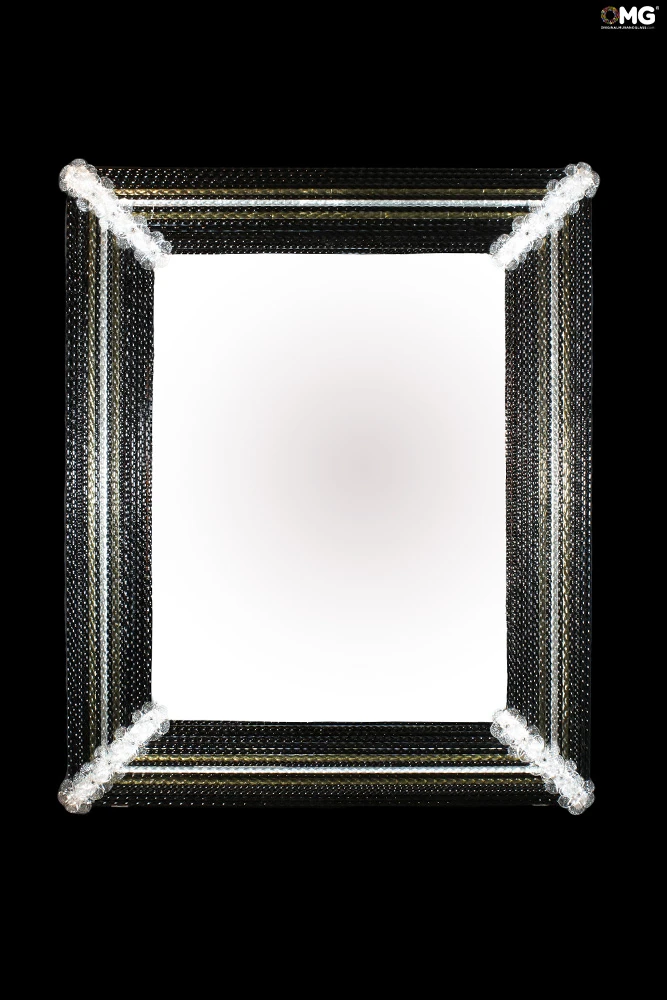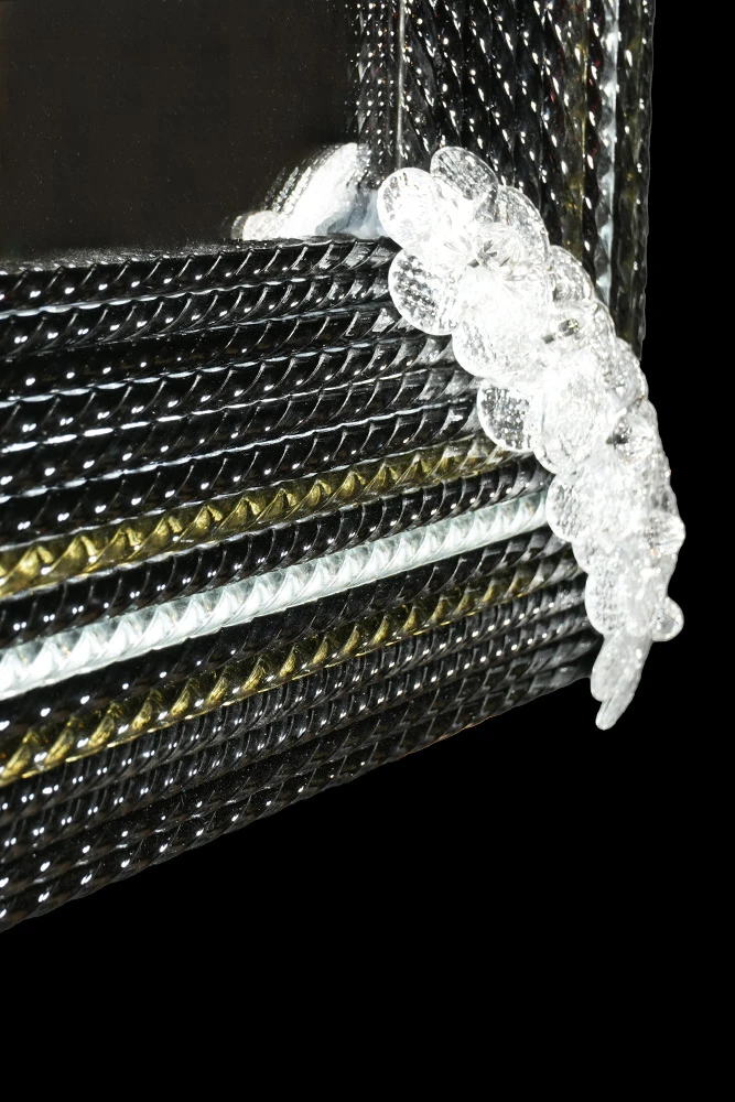 The mirror consists of flowers and canes curls, with glass gold and black, and clear glass detail and wooden frame.