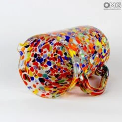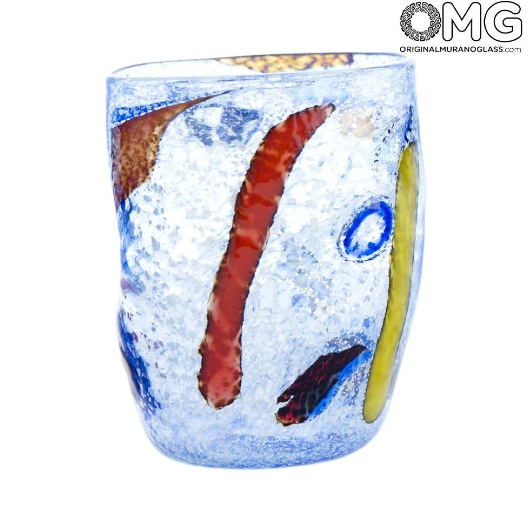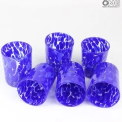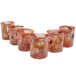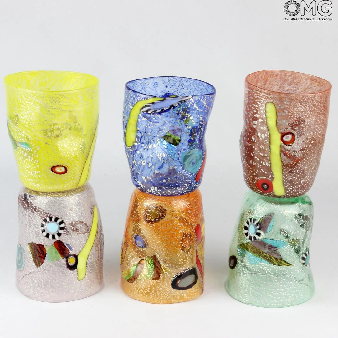 Cool set of 6 drinking glasses blown with silver, millefiori, and polychrome millefiori canes. Perfect to impress your guests while serving a good wine, a cocktails or simply water. These are the famous “Goto da fornase”. The tradition says Glass Masters used to drink in this kind of cup during working time in Furnace. All items are handmade and unique. Note: the set is always differents of the one in photos, we do not use stamps, and colors are mix and random texture for each piece.