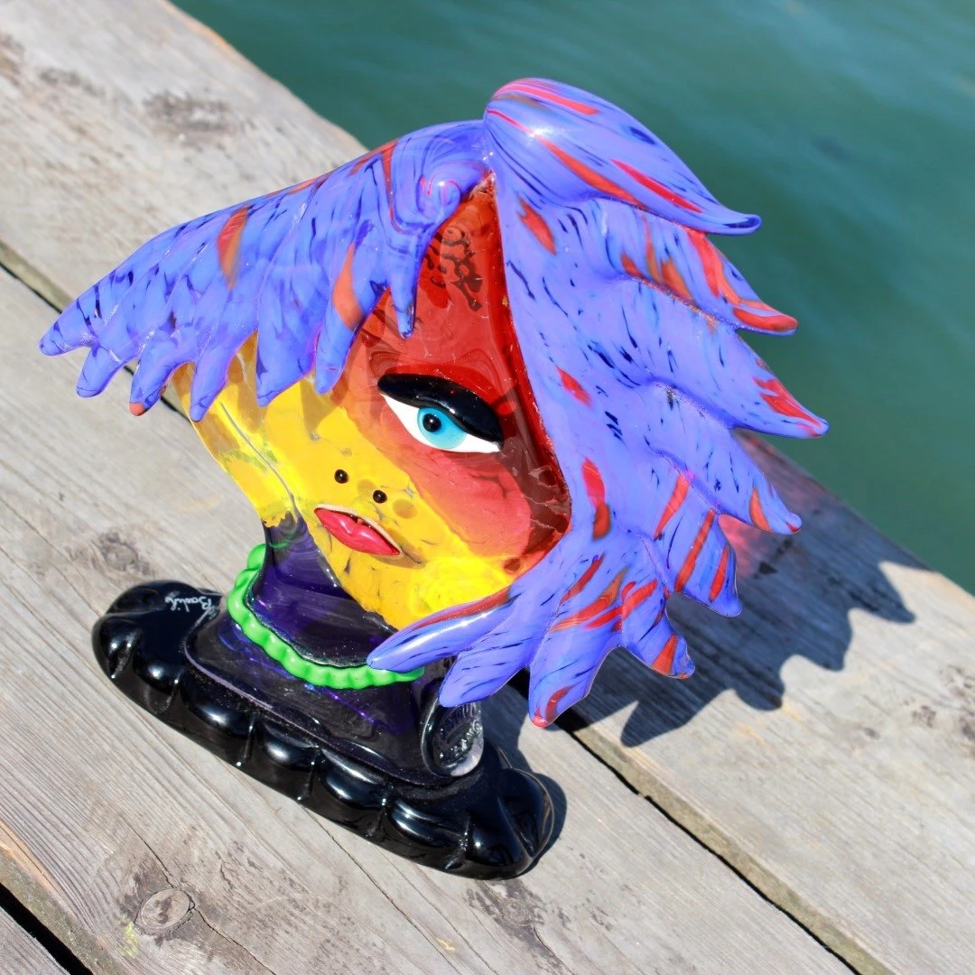 Abstract Murano glass sculpture with modern design. The style is reminiscent of the paintings of the great artist Picasso, surrealism has been reinterpreted in punk and pop style. Shades of colors and strong visual impact make of this sculpture a unique piece of art.