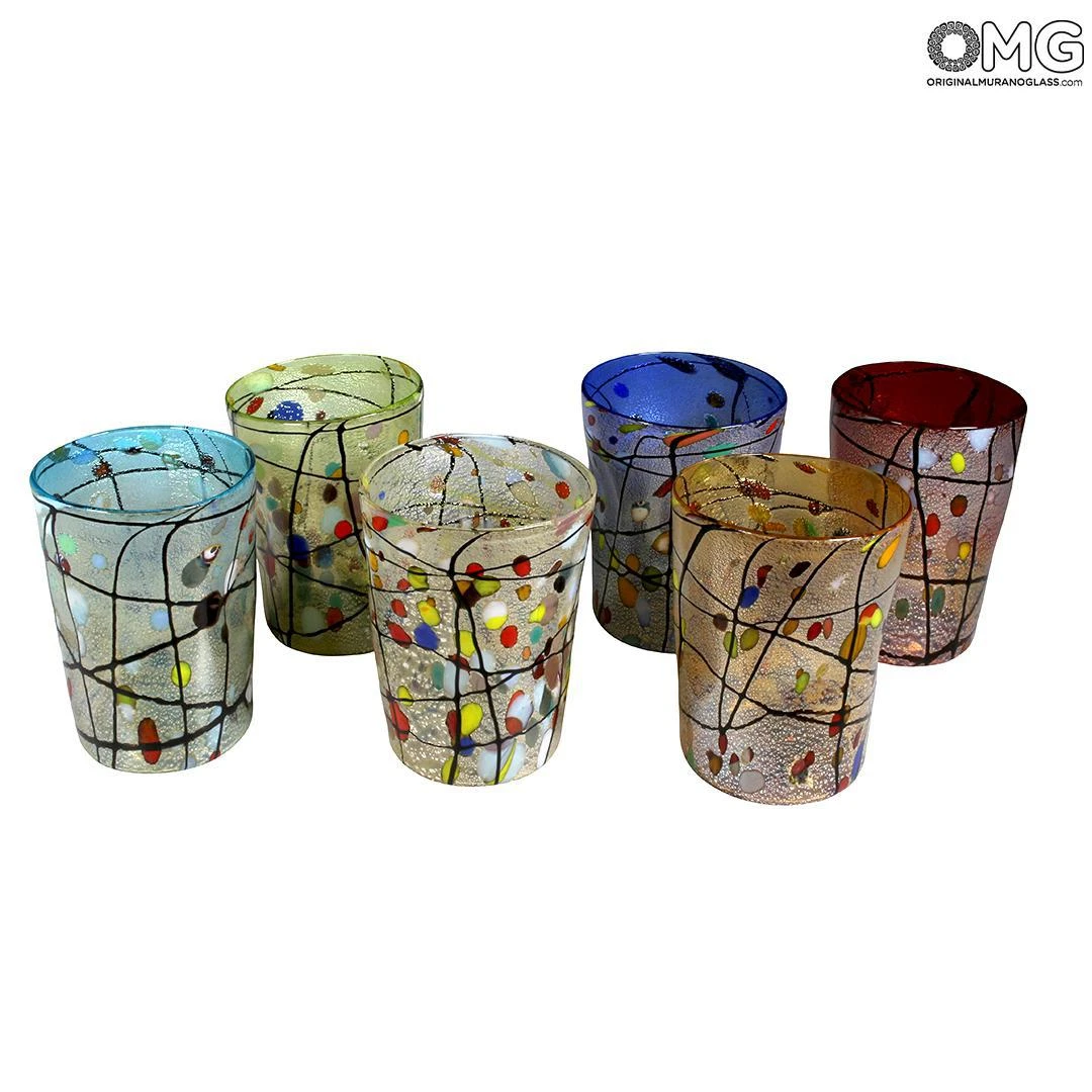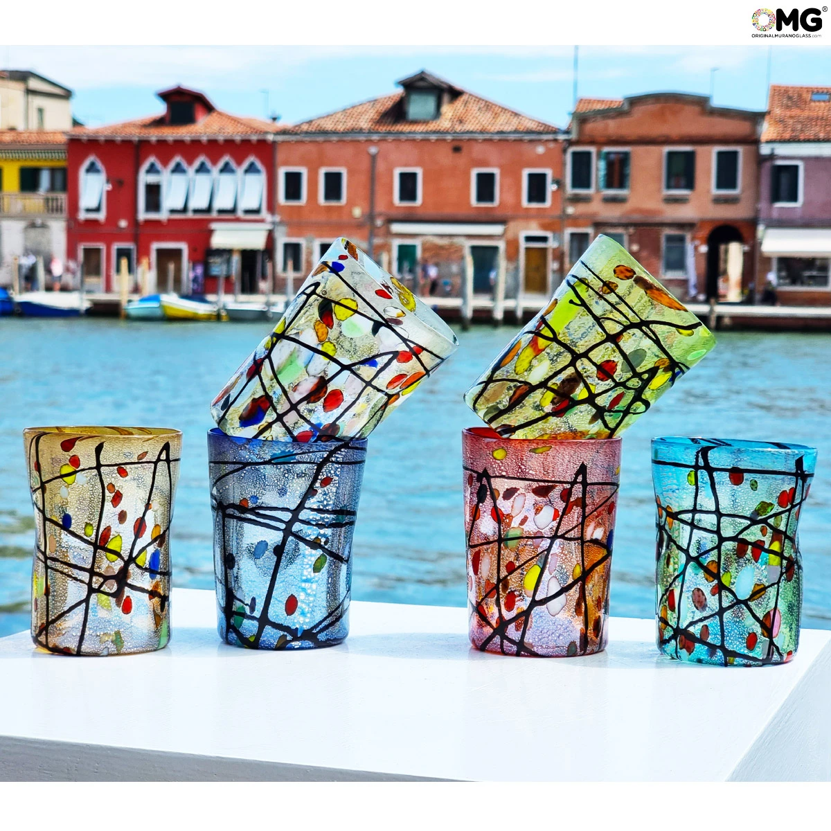 Hand-blown Murano glass Venetian tumblers with pure silver. Decoration inspired by Vassily Kandinsky’s abstract art.