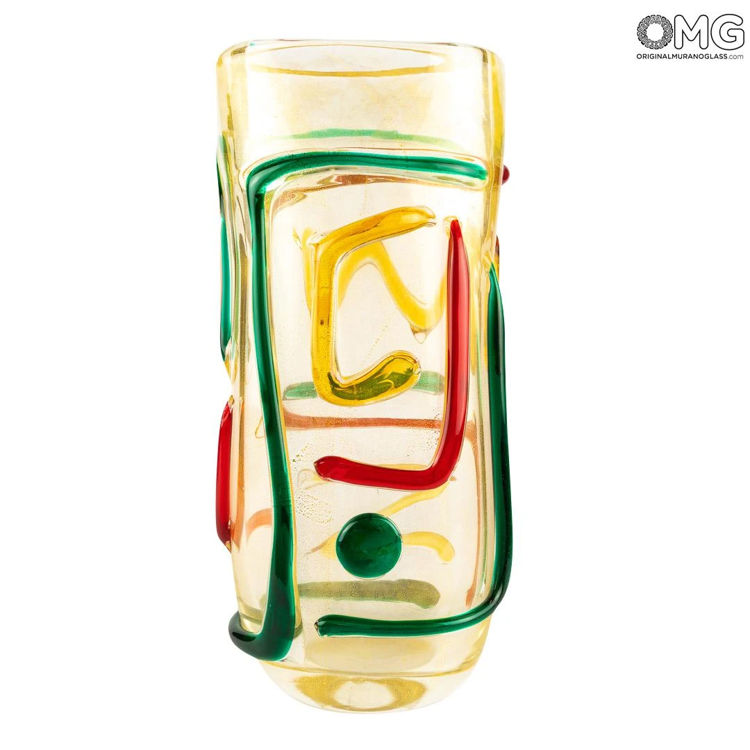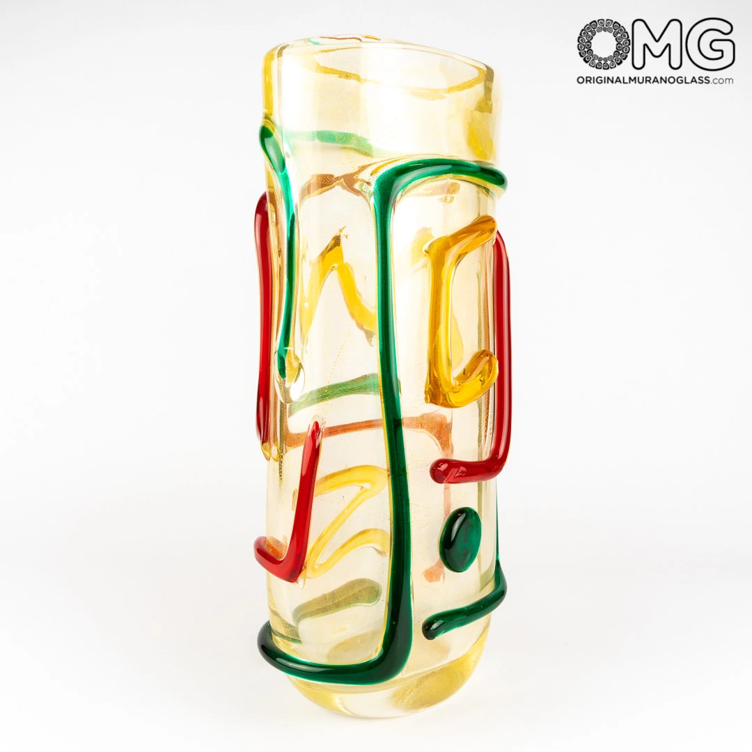 Handmade blown vase in crystal and gold 24 carats leaf with colored details.