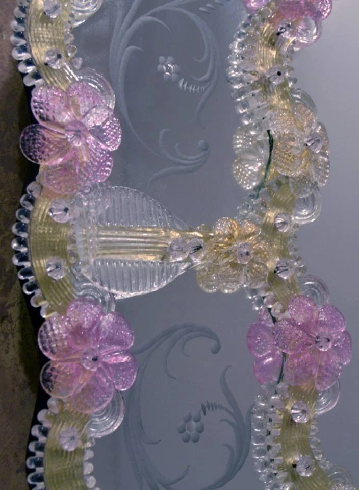The mirror consists of flowers and canes curls, with glass fused with 24kt gold, and wooden frame.