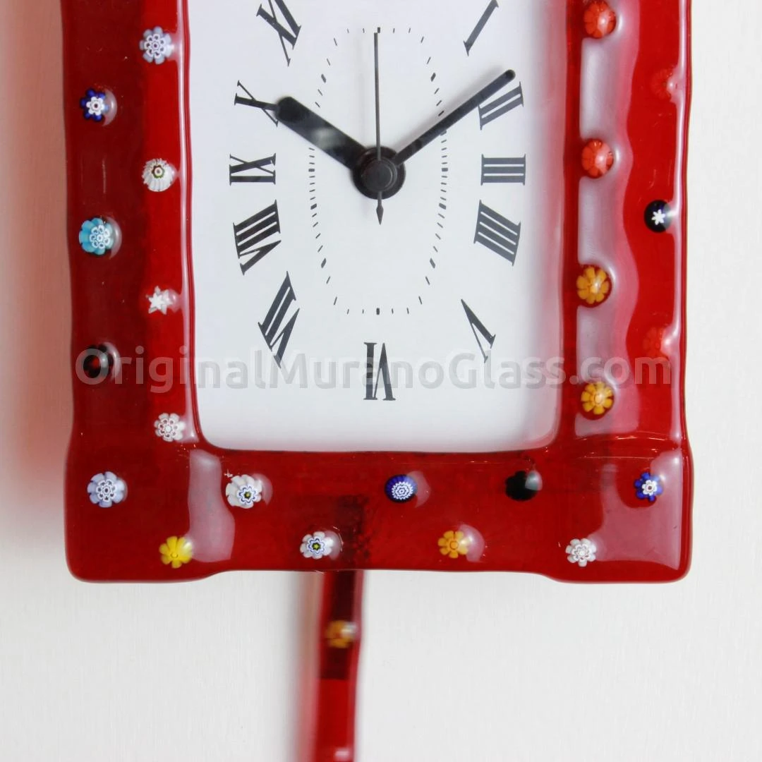 Pendulum clock made with the technique of fusion of the glass. Red clock with small murrine in the glass frame.