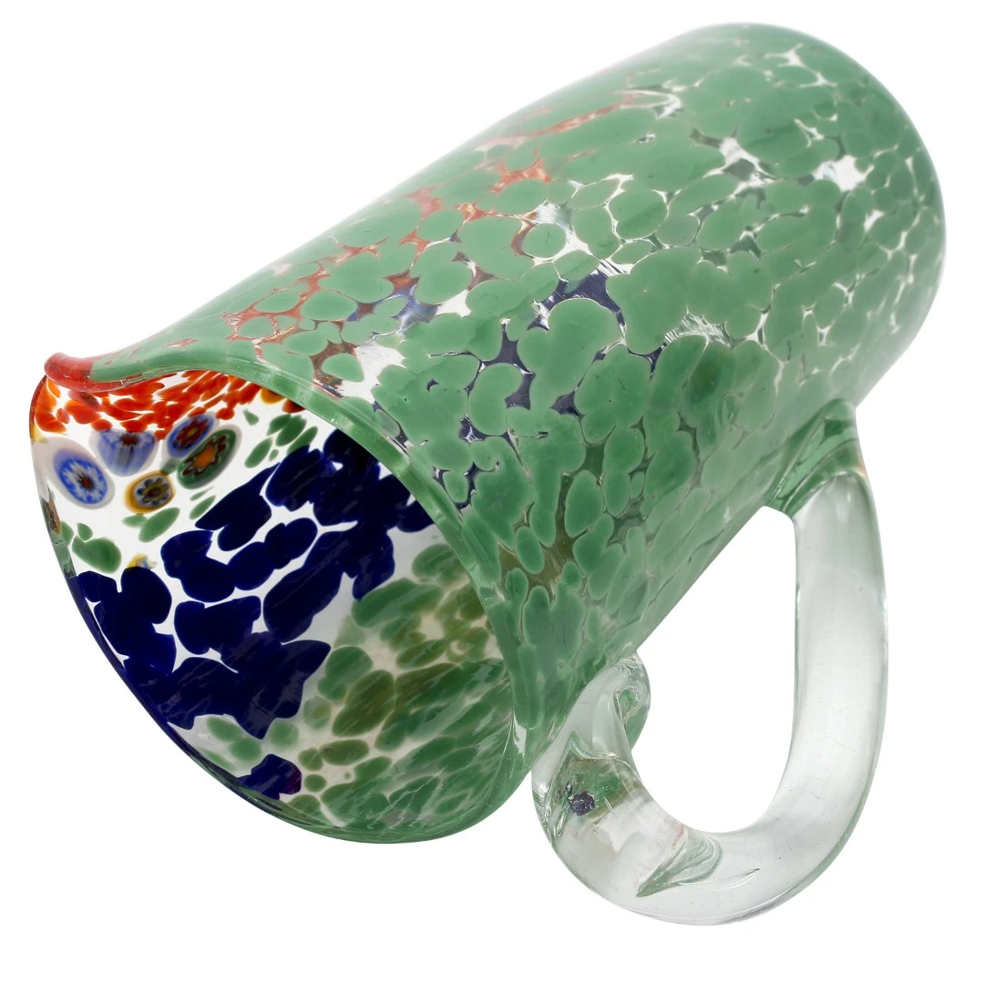 Pitcher in venetian glass handmade with the technique of glass blowing, with multicolored glass spots and millefiori decoration. This original Murano glass vase is signed by the glass master.