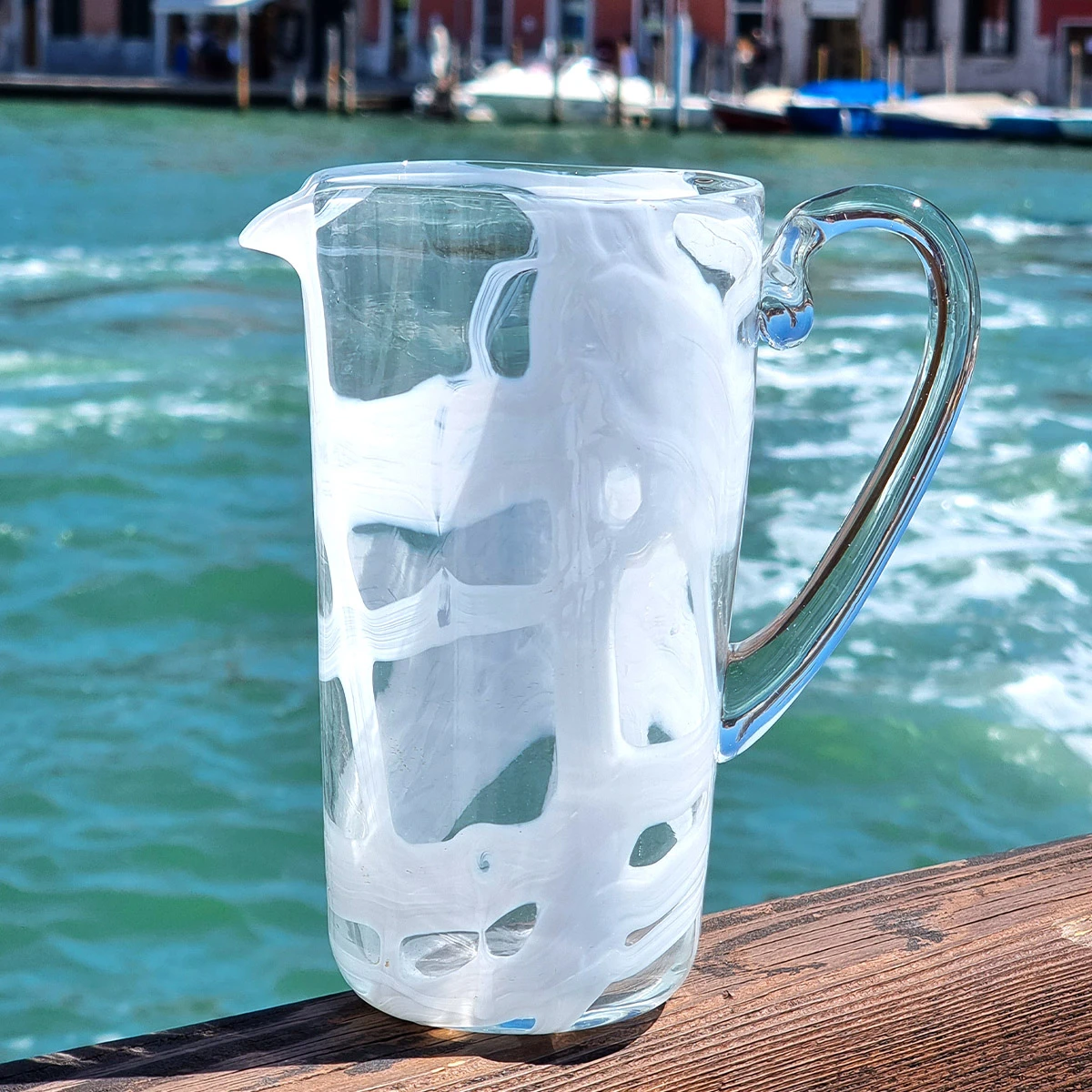 The jug holds 1,5 litre and it can be made in the color you prefer (write it in the cart’s note while purchasing the set and our glass master will make it as you wish).