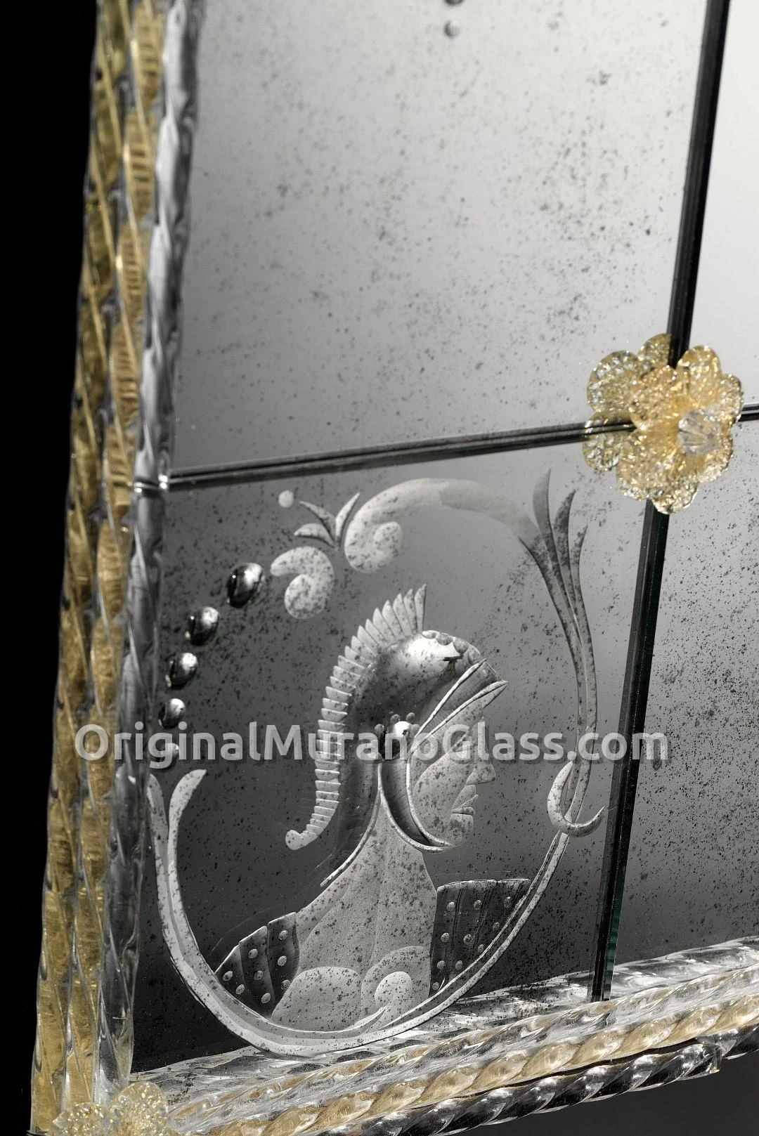 The mirror consists of 12 flowers, different characters Venetians and canes curls, with glass fused with 24kt gold, and wooden frame.