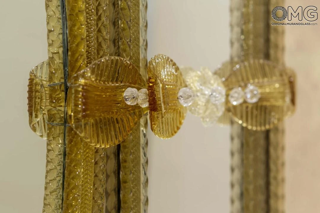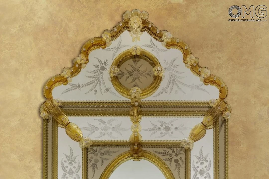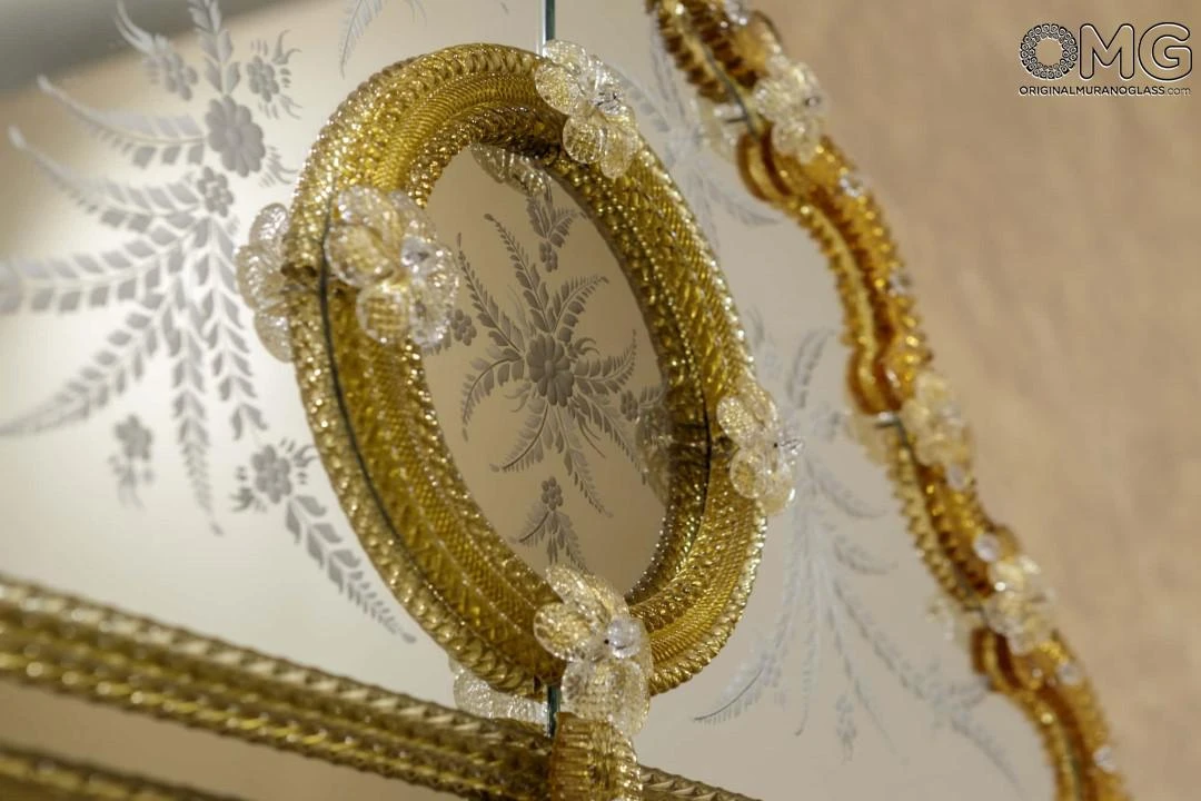 The mirror consists of flowers and canes curls, with glass fused with 24kt gold, and wooden frame.