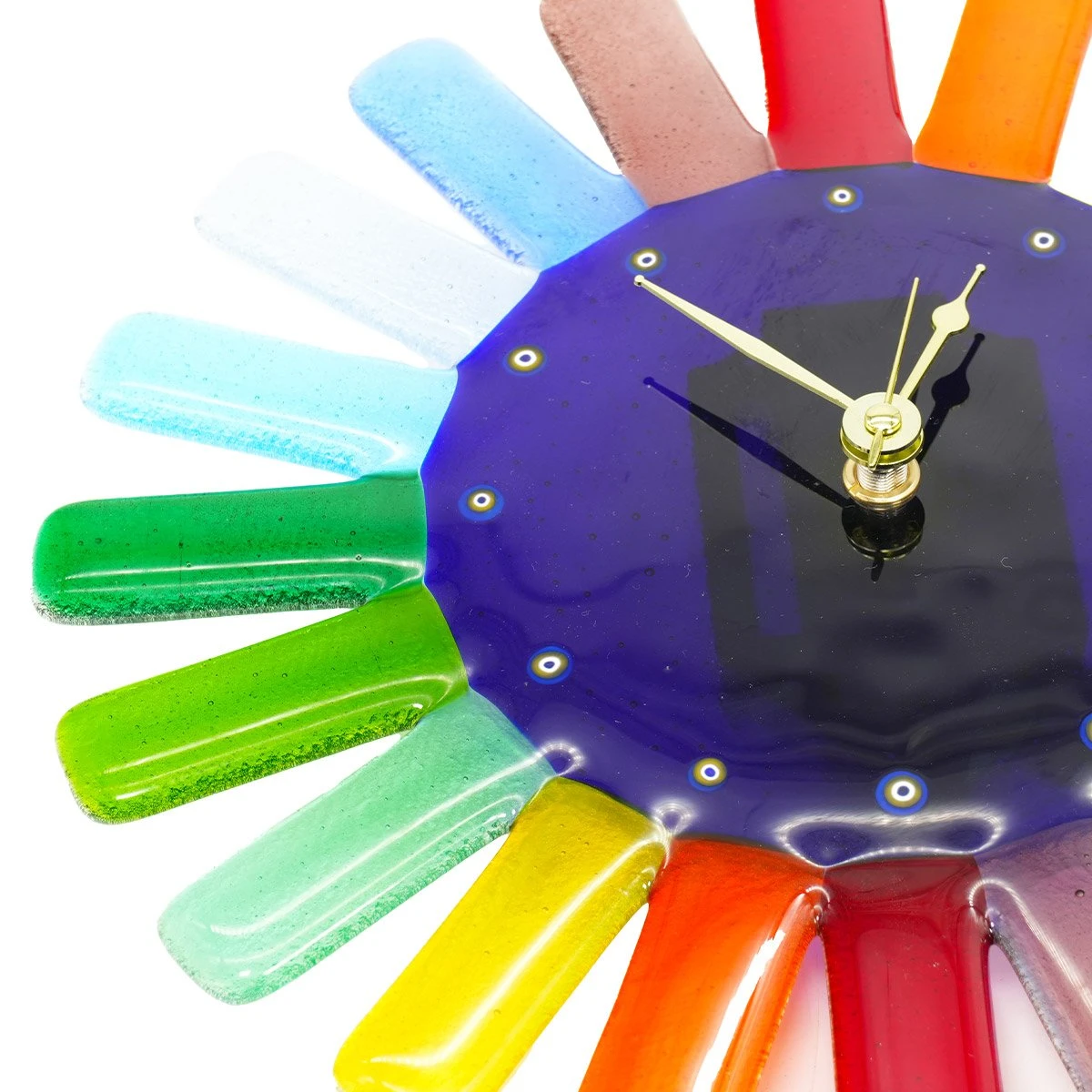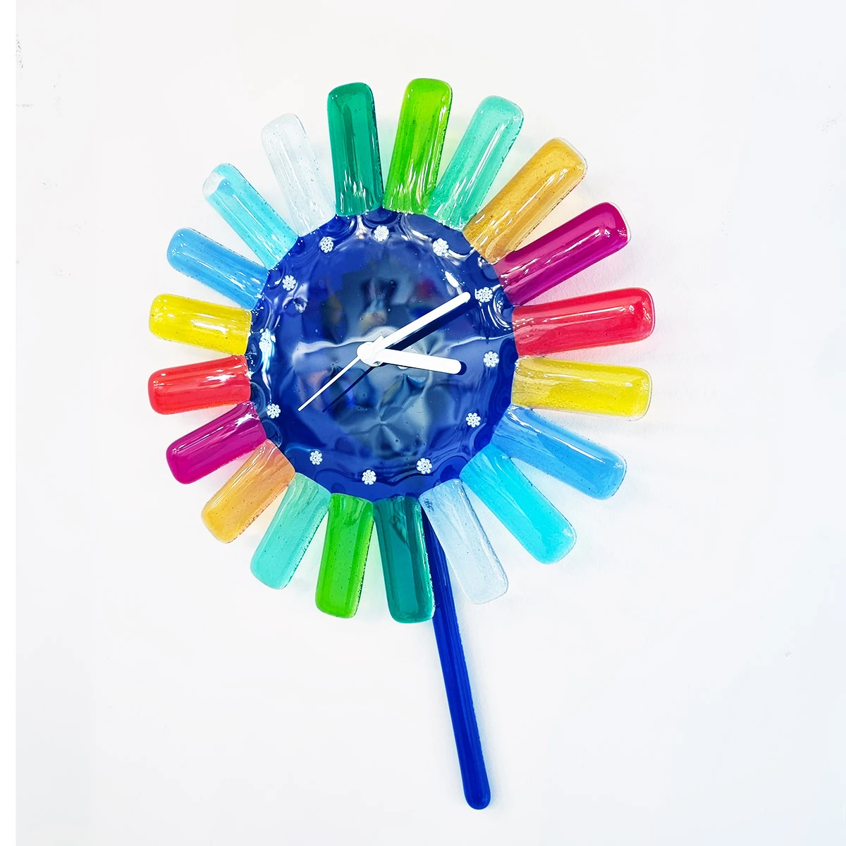 Colorful pendulum wall clock made with glass fusing technique. Perfect art work to give a touch of cheerfulness to your house or office. Lovely also as gift idea for an useful and funny present.