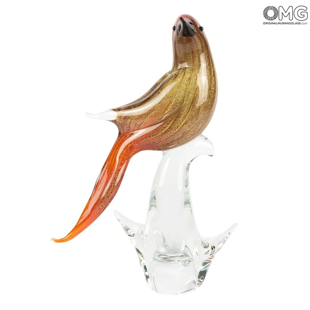 Sinuous sculpture of blackbird in red with real pure gold leaf on crystal base, worked free hand on a punty in solid glass with the glass working techniques in Murano. This lovely sculpture, extremelly elegant, is the perfect artwork for a luxury shelf or to complete your rich furniture. You can put it under the light of a lamp, on the table or near a plant. Wherever you locate it, this elegant sculpture will gift you all its charm.