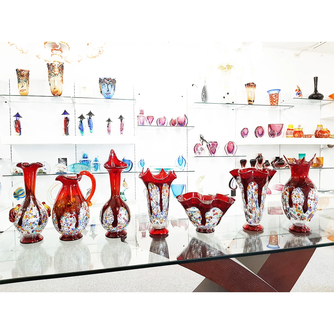 Vase made with the technique of blown glass, decorated with silver leaf and colorful variegated murrine.