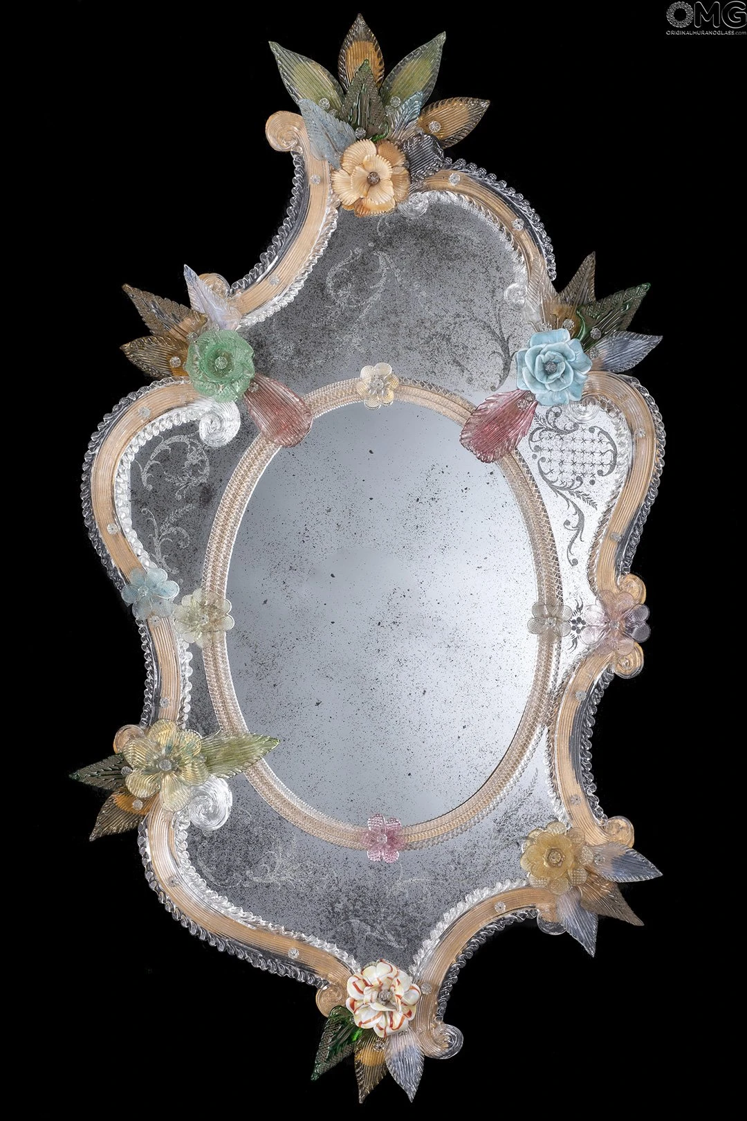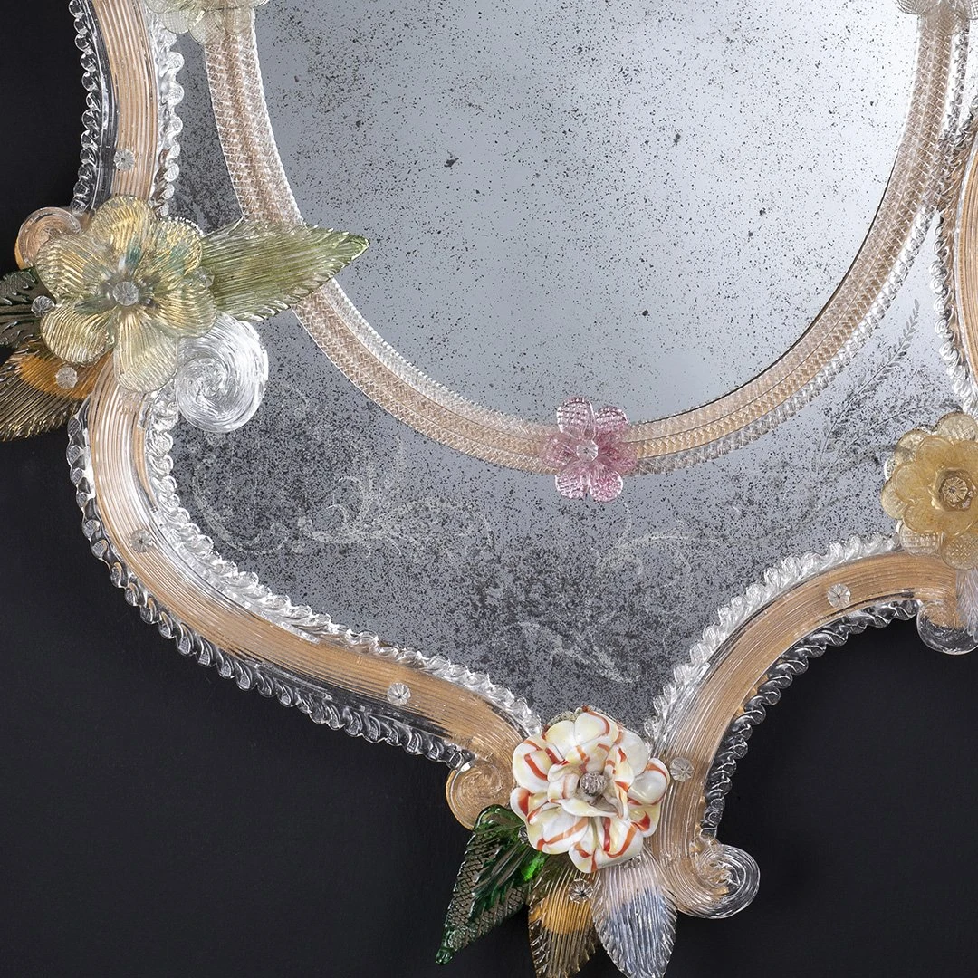 The mirror consists of a floral decoration made with Murano glass flowers and leaves, with multicolored Murano glass matt flowers.
