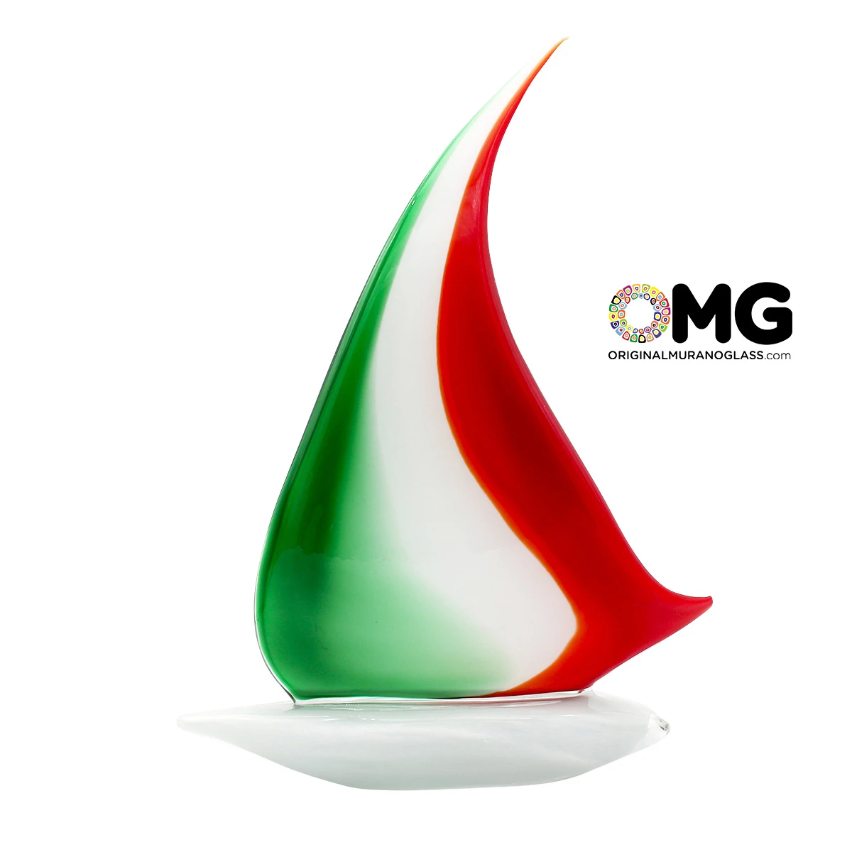 Very nice sailing boat Italy flag, multicolor glass, worked free hand on a punty in solid glass. Ground and polished by Hand. Made by the master.
