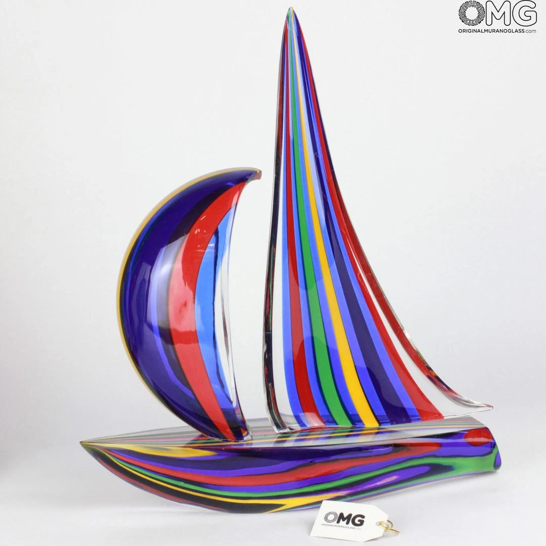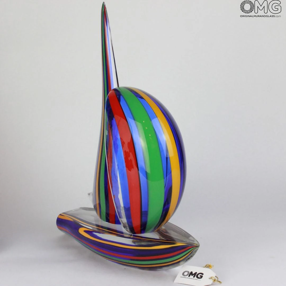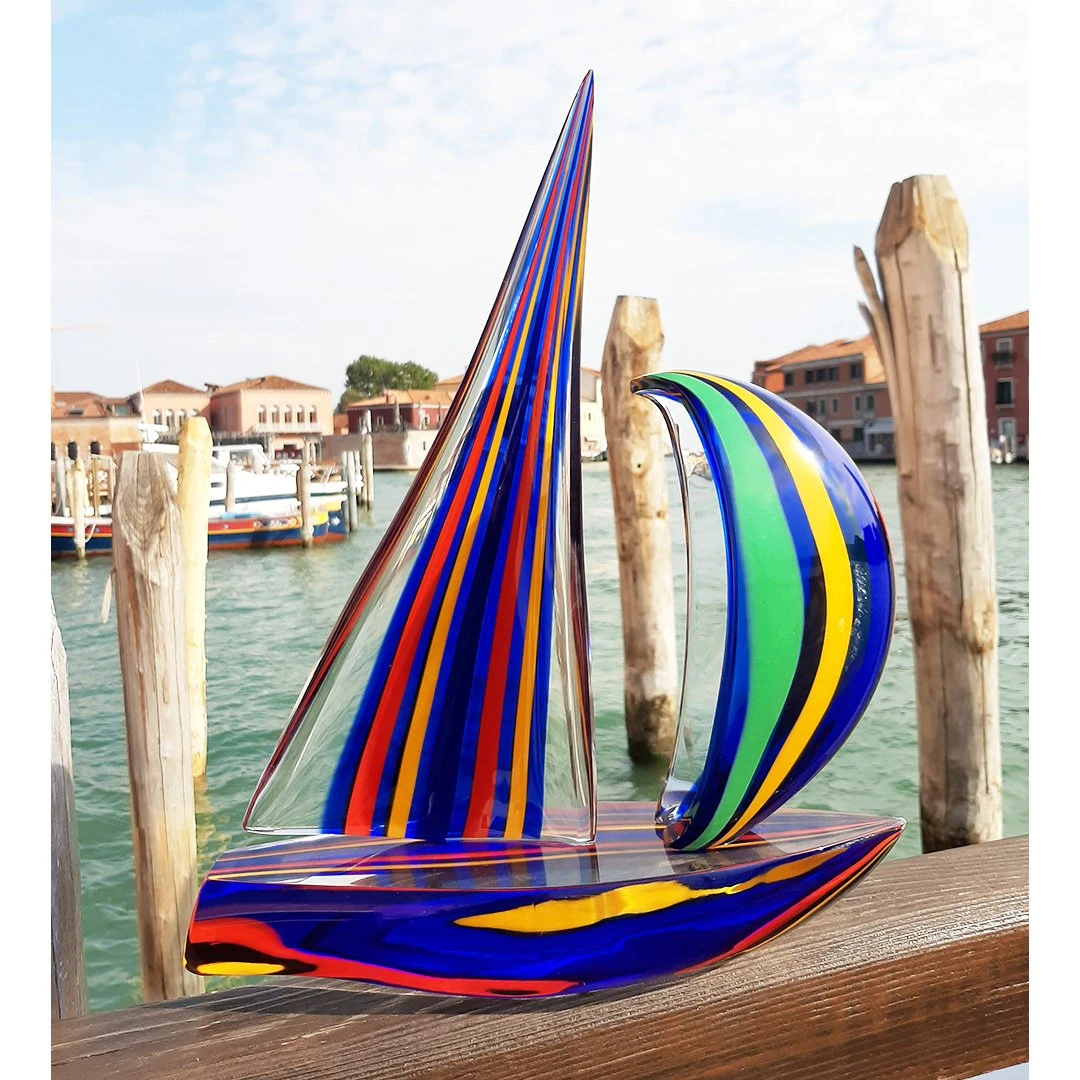 Abstract sail boat sculture perfect to decorate tables or shelves. Our Murano glass sail boat sculpture is a classic of the Murano glass art and are often used not only to decorate houses or office but also as gift, present, throphy for events and competition and in many more differents way. Lovely colors obtained by the use of colored glass canes and filigree.