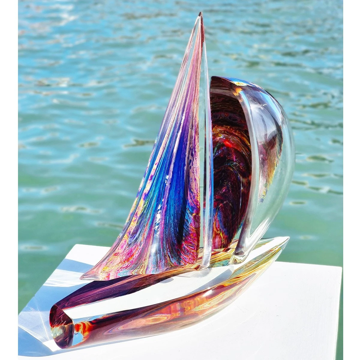 Particularly difficult to realize, chalcedony glass has the peculiarity of joining the canonical glass sphere with silver salts and other coloring oxides: this extraordinary chemical process, coupled with the talent of the Masters of Murano, allows the creation of wonderful works in which an opaque background is streaked with enchanting warm and dark shades, a real turbine of lights and shadows capable of ravishing even the eyes of the most experienced observer.
