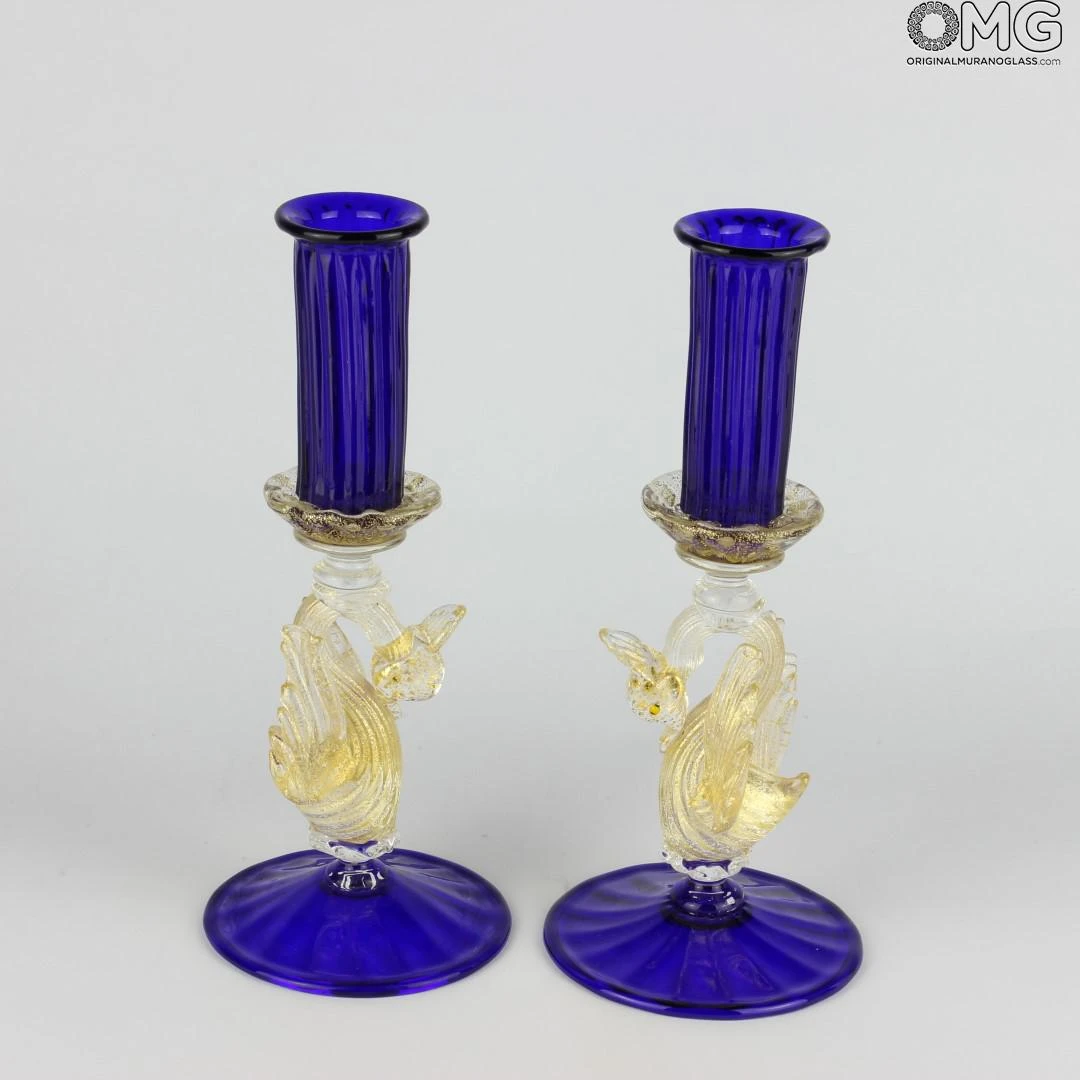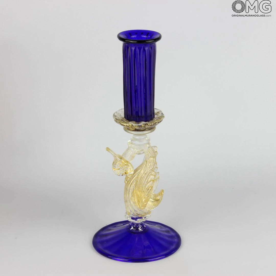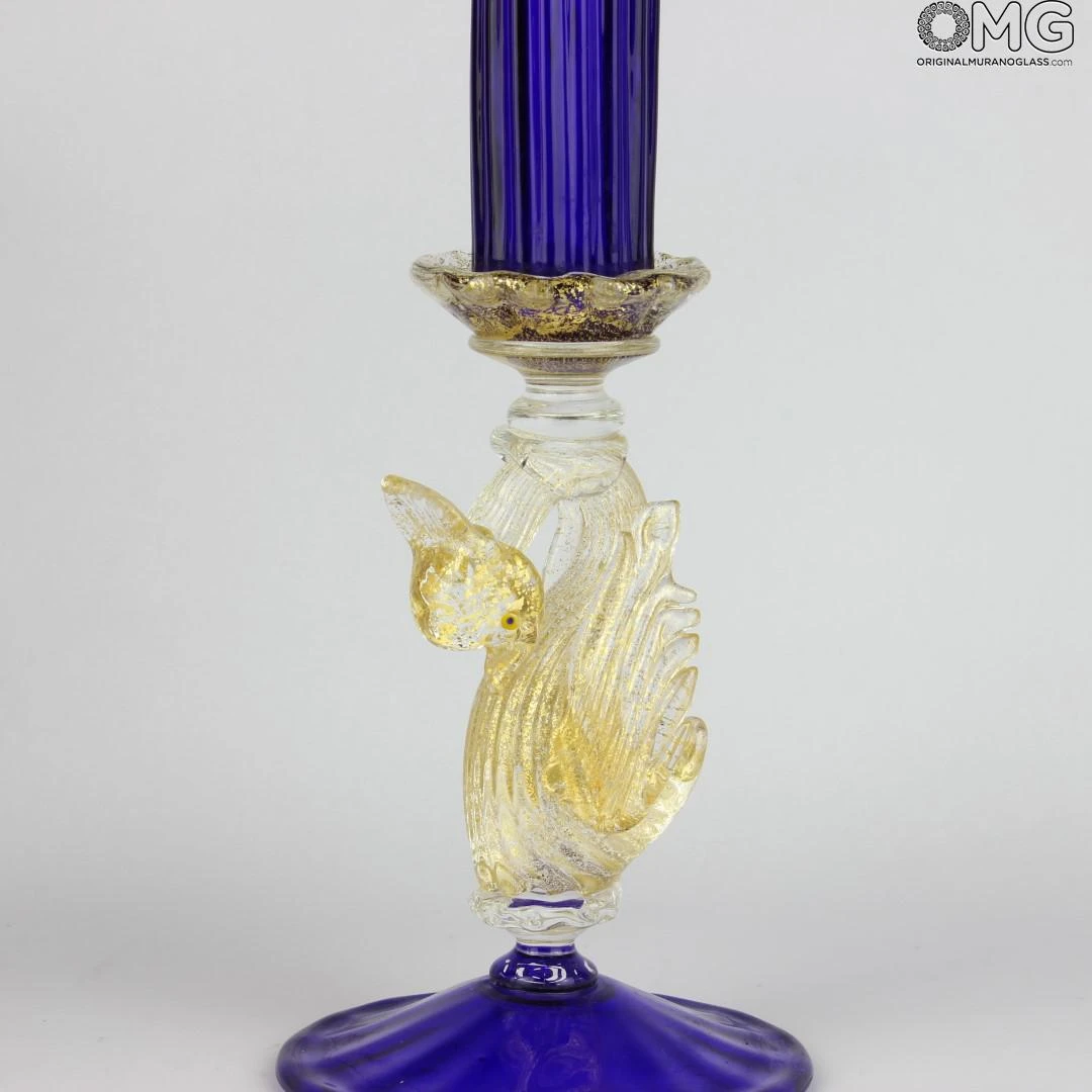 Detailed handmade candle holder made using the traditional Murano Glass technique. The holder is in blue glass and the stem is in transparent Murano crystal glass with gold 24 carats. Perfect for your candlelight dinners in venetian style.