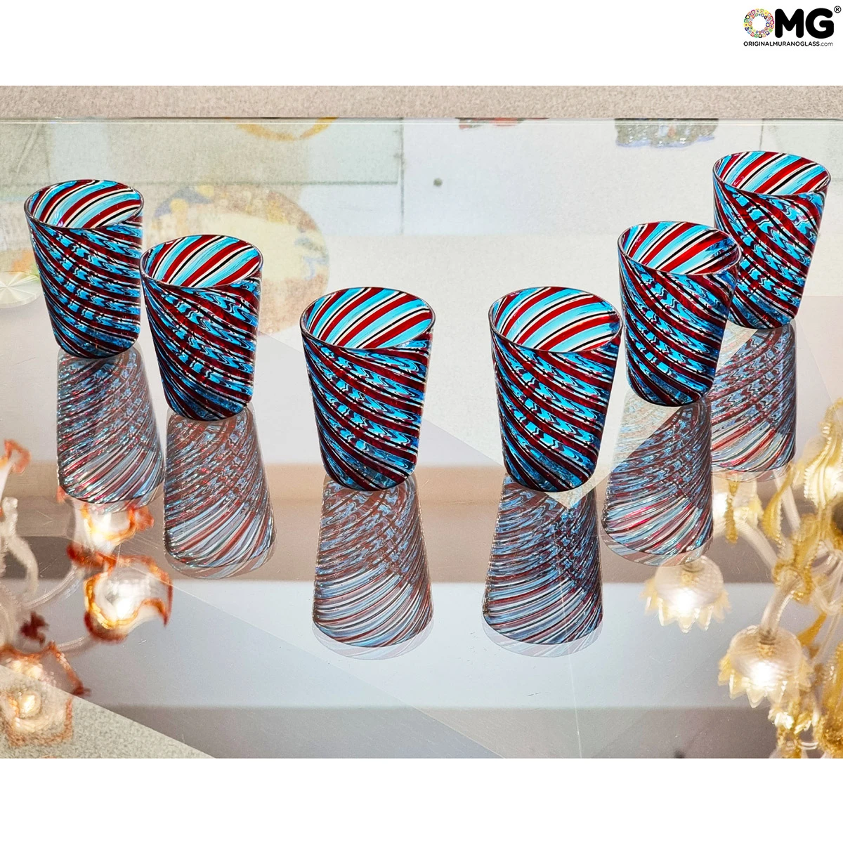 Make your table more precious with this set of 6 glasses, blown made in Original Murano Glass. The glasses are twisted by the glass master to give exclusive elegant glass effect on the surface.
