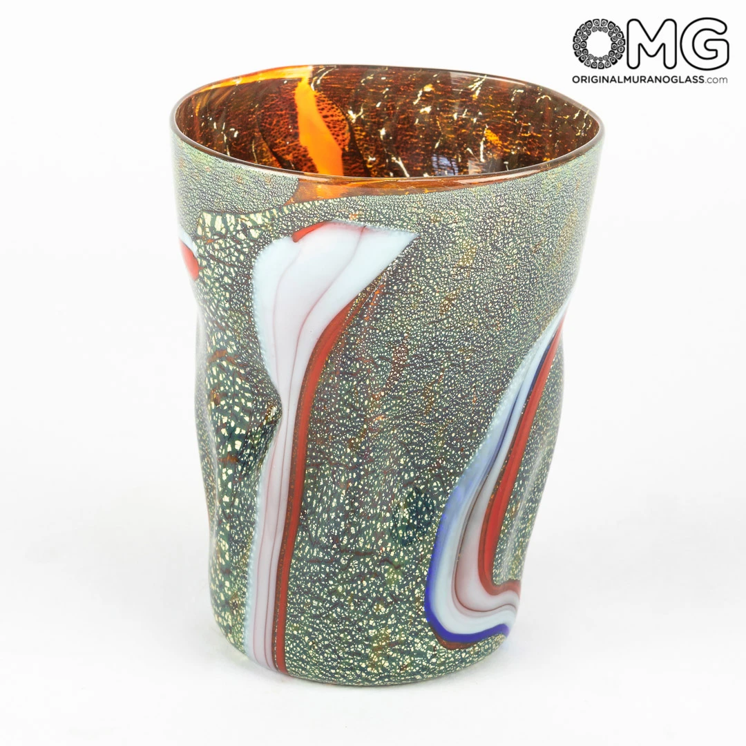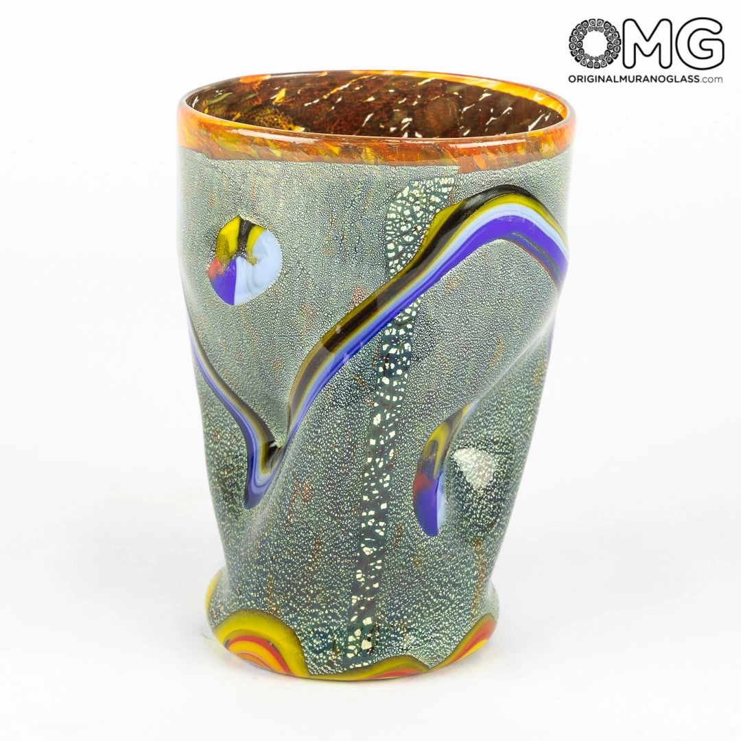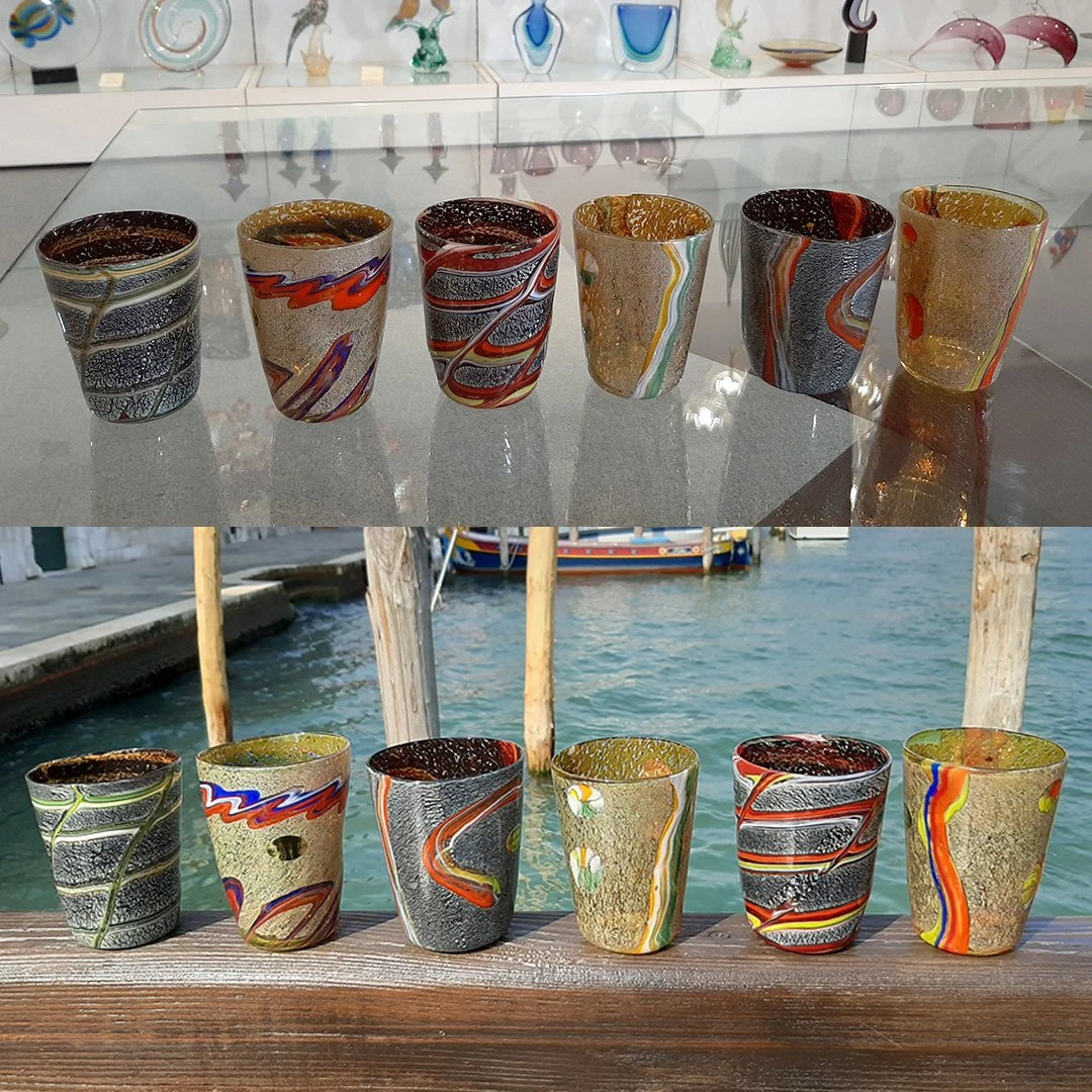 Very nice set of 6 glasses. All items are different, handmade with real silver leaf on a base of colored glass. It is the famouse “Goto da fornase”, the tradition says Glass that glass master uses to drink in Goto during working time in Furnace. Note: the set is always differents from the one in photos, we do not use stamps, and colors are mixed randomly, so murrines texture for each piece can be little different.