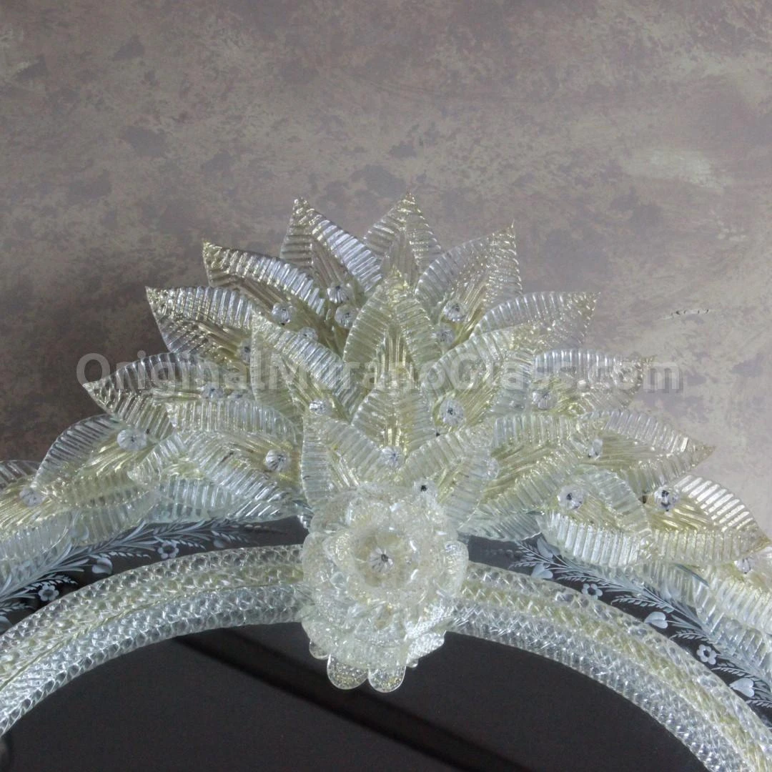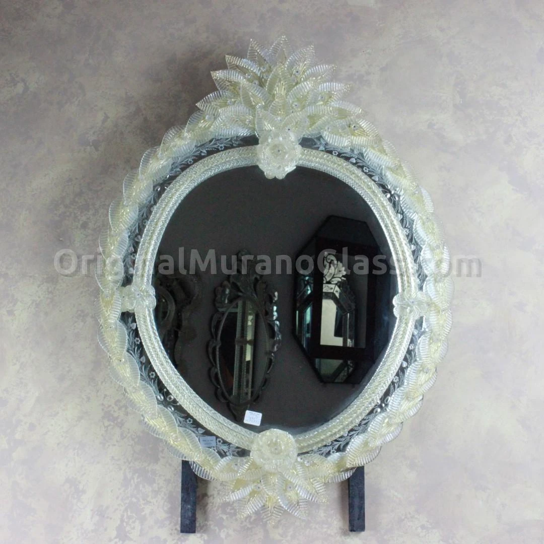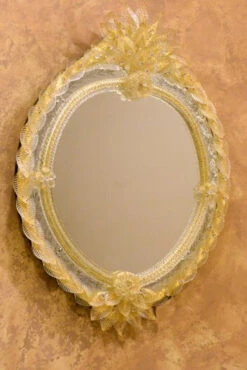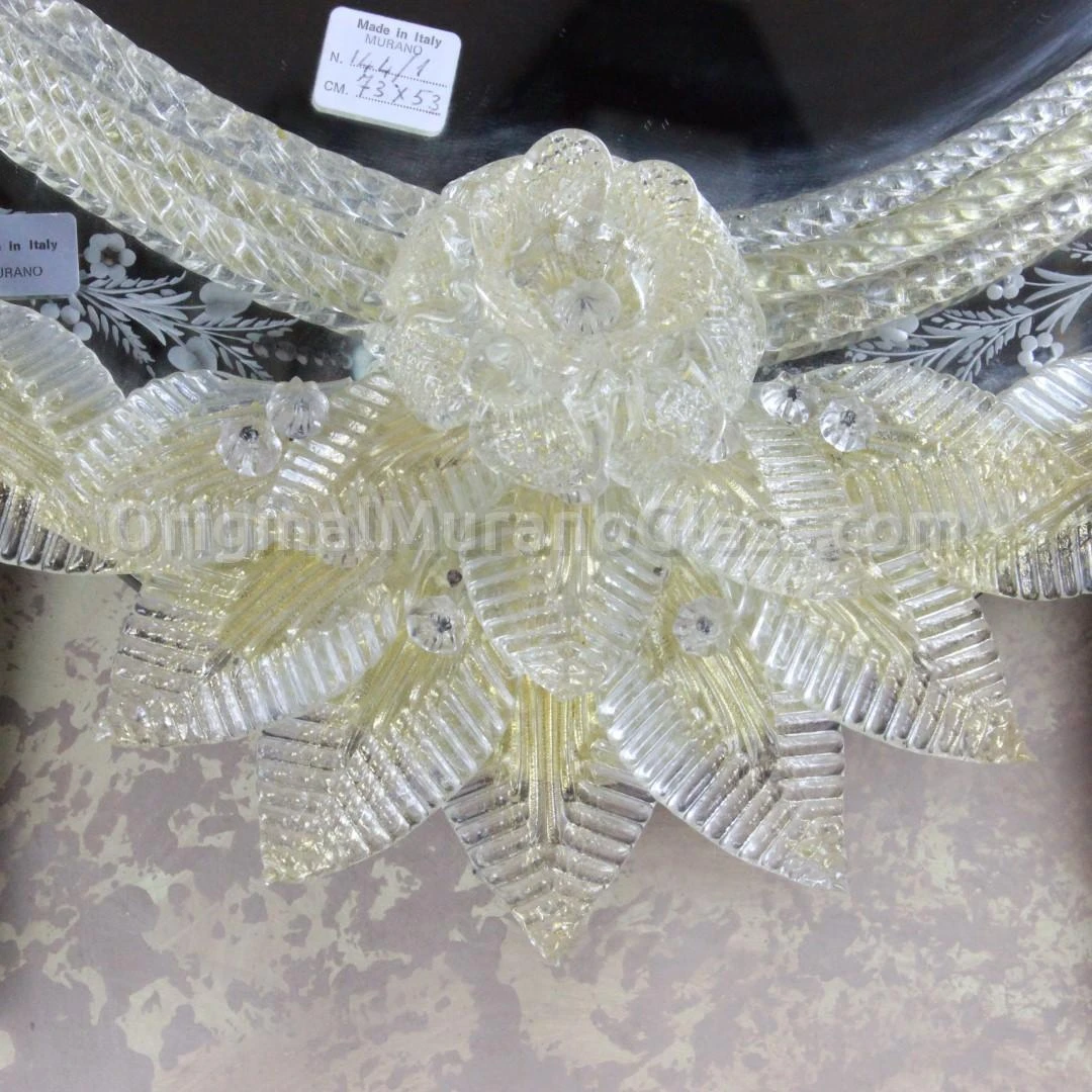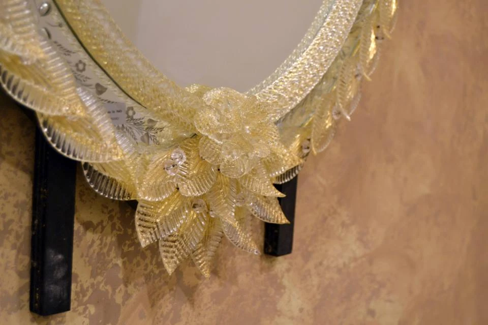 The mirror consists of 8 flowers and canes curls, with glass fused with 24kt gold, and wooden frame.