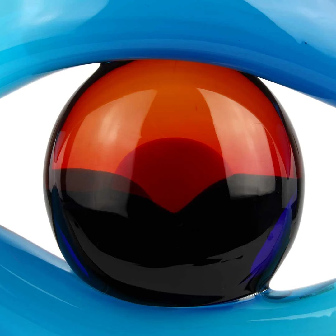 Sculpture that represents the Eye of Divinity floating on a solid base. Bright colors and great dimensions make it perfect for your modern home furniture. The artwork is unique and signed by the glass master.