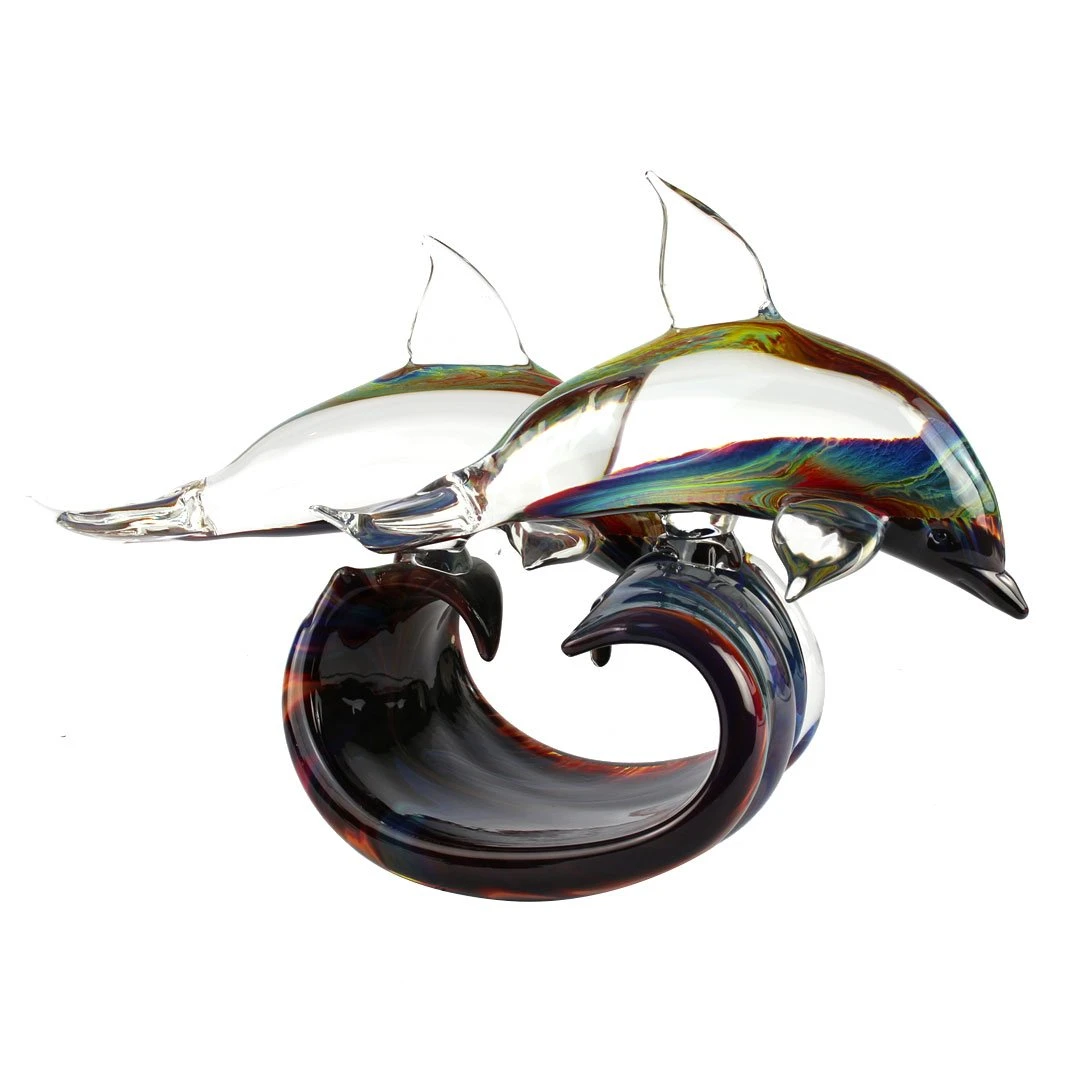 Exclusive and unique glass artwork of two dolphins handmade in clear glass and , realized in free hand on a punty in solid glass. The sculpture is polished and cold glass cut by sandstone.