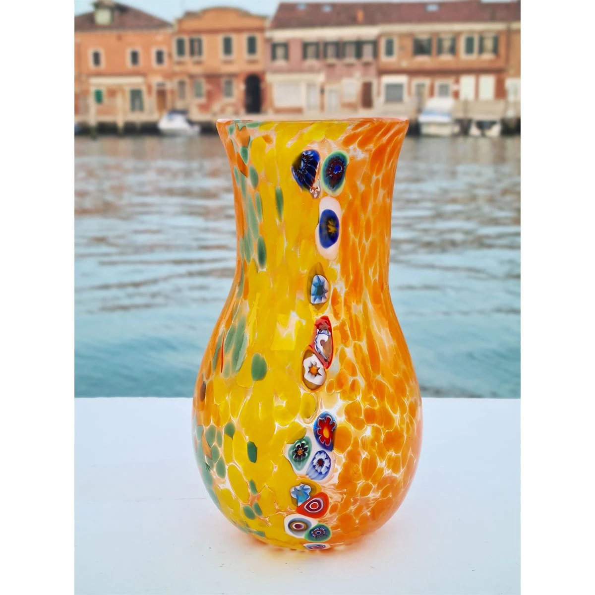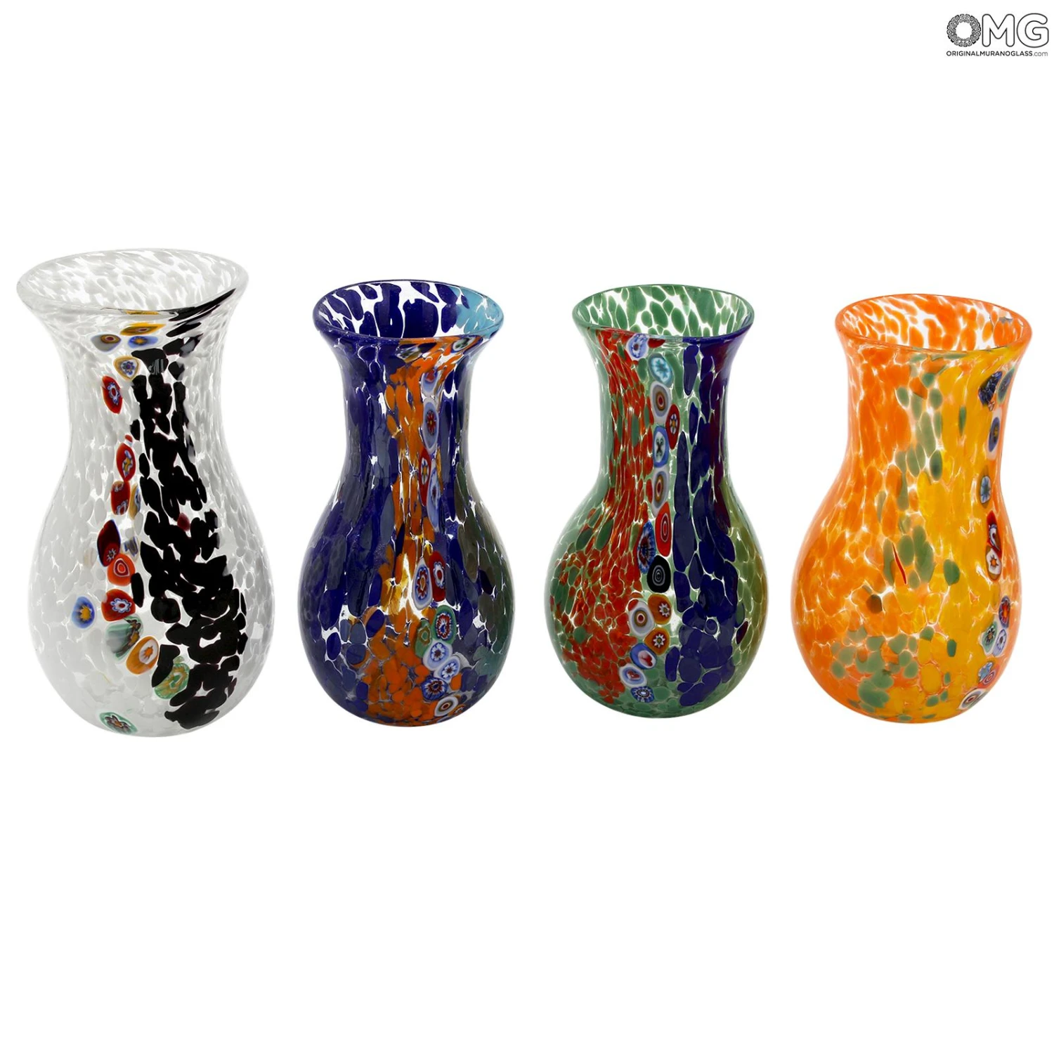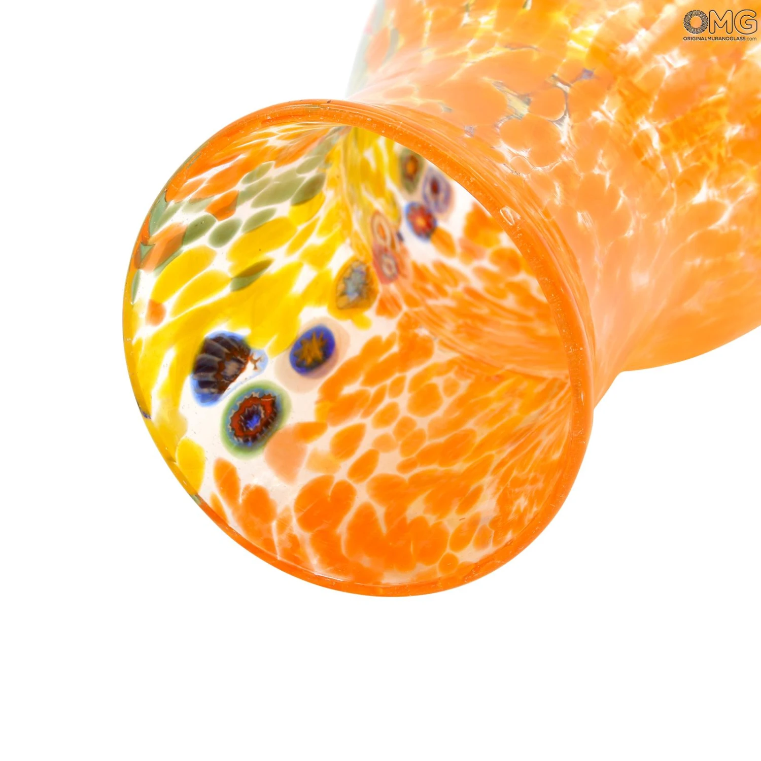 Bowl vase centerpiece in venetian glass handmade with the technique of glass blowing, with multicolored glass spots and millefiori decoration. This original Murano glass vase is signed by the glass master.
