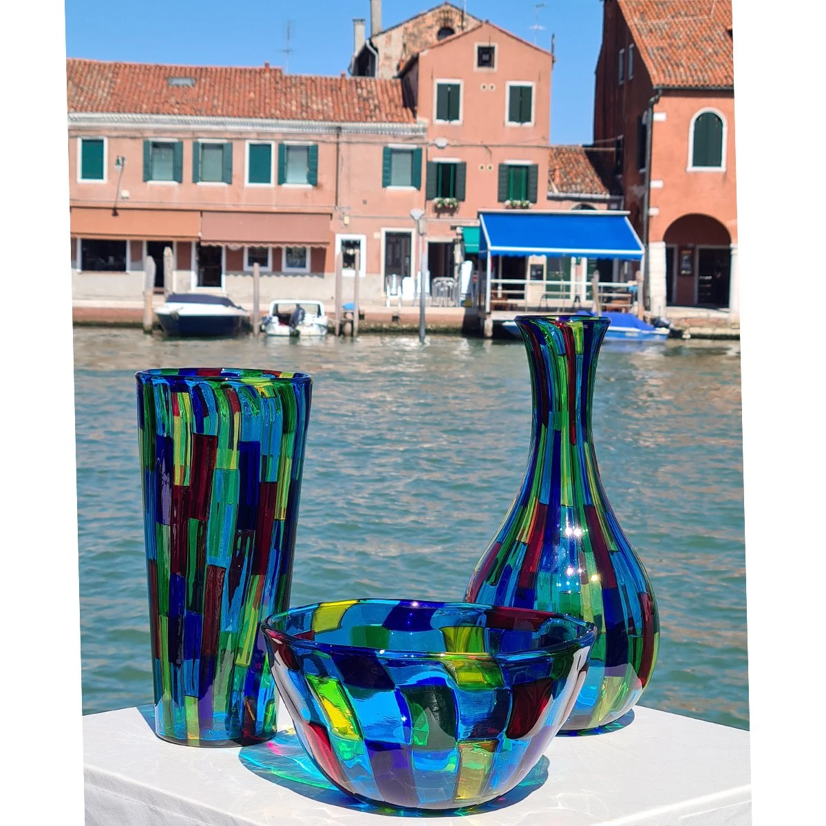Venetian Vase in Original Murano Glass OMG handmade and blown with attention to detail. It is made with light blue, red, yellow, blue, transparent crystal glass, to make the vase shine even more exclusively.