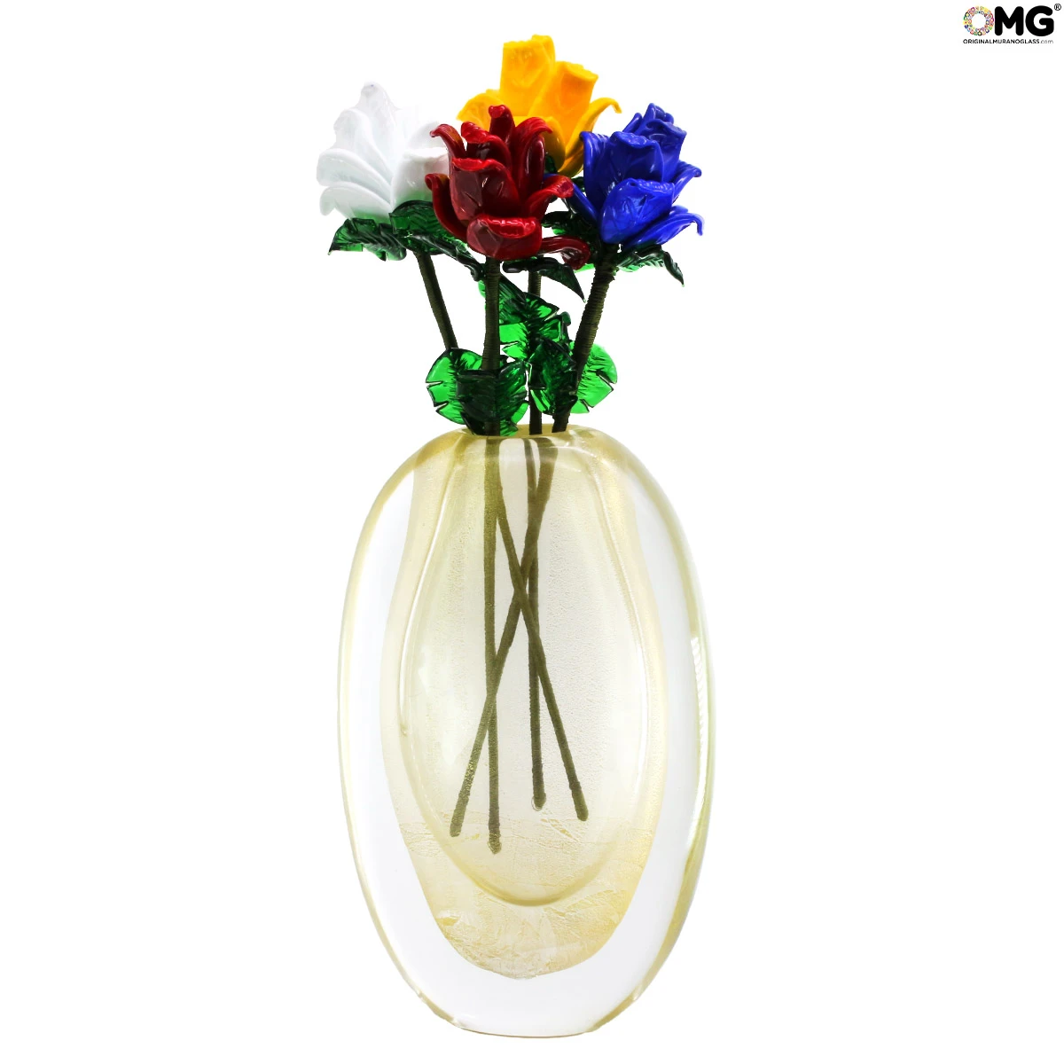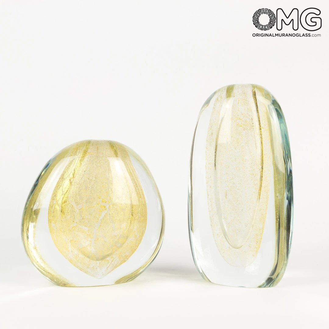 The gold leaf is the element that gives to this vase its particular aurea. A classic centerpiece becomes in this way an art object usefull for decorating an imperial table or a wood furniture. For sure gold has been ever seen as an element of richness and powerfulnes. Used together with glass it remember us today the past centuries, when the Serenissima was an imperial over the sea and the others country of Mediteranean sea. An example about how glass masters of Murano used to transform in art what they lived. A vase who doesn’t need flowers to talk about elegance and richness. Try it on a dark wood surface or over the fireplace to highlight the gold listings. Discover all the collection!