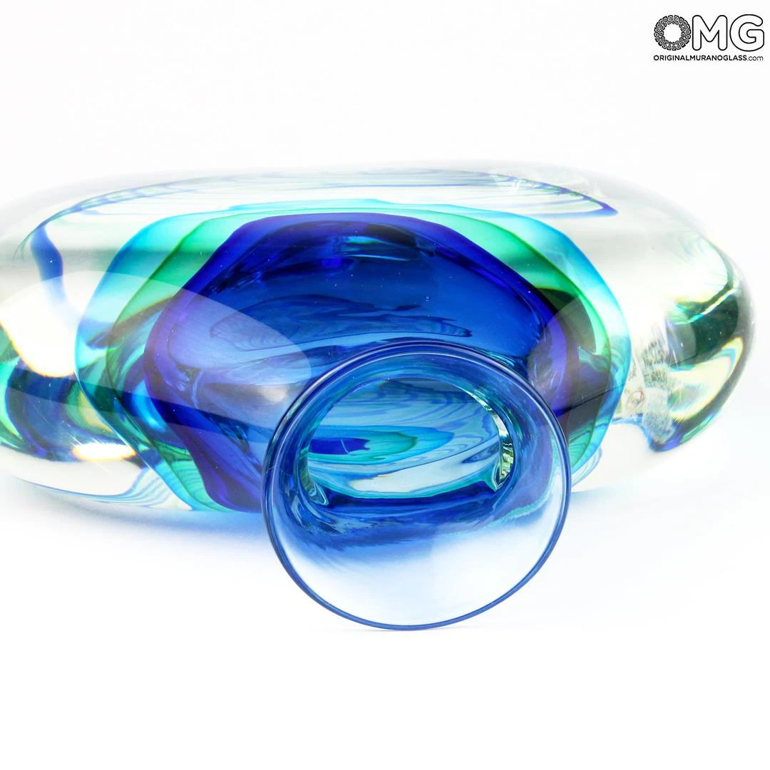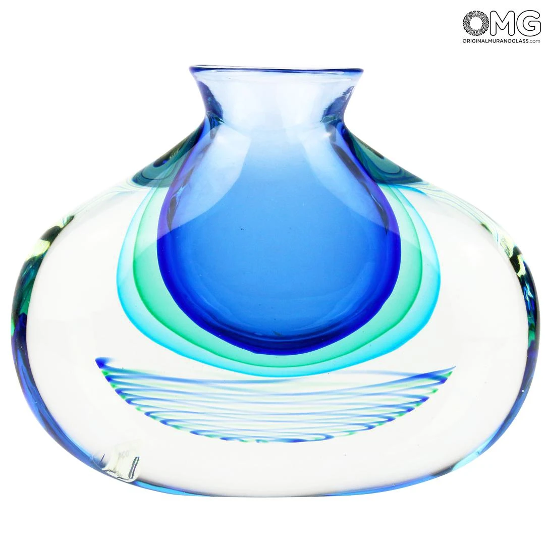 Handmade vase of noble facture. A primary mass of blue became covered by a new mass of light green, than covered again with light blue. A mass of crystal is used to cover the colored one an finally the work is modeled. All became covered with a new mass of cristal. The vase once blown receive its last working and the artpiece is so done. A colorfull vase but at the same time elegant and sober. Well to furnish a vaste kind of furniture or to host flowers.