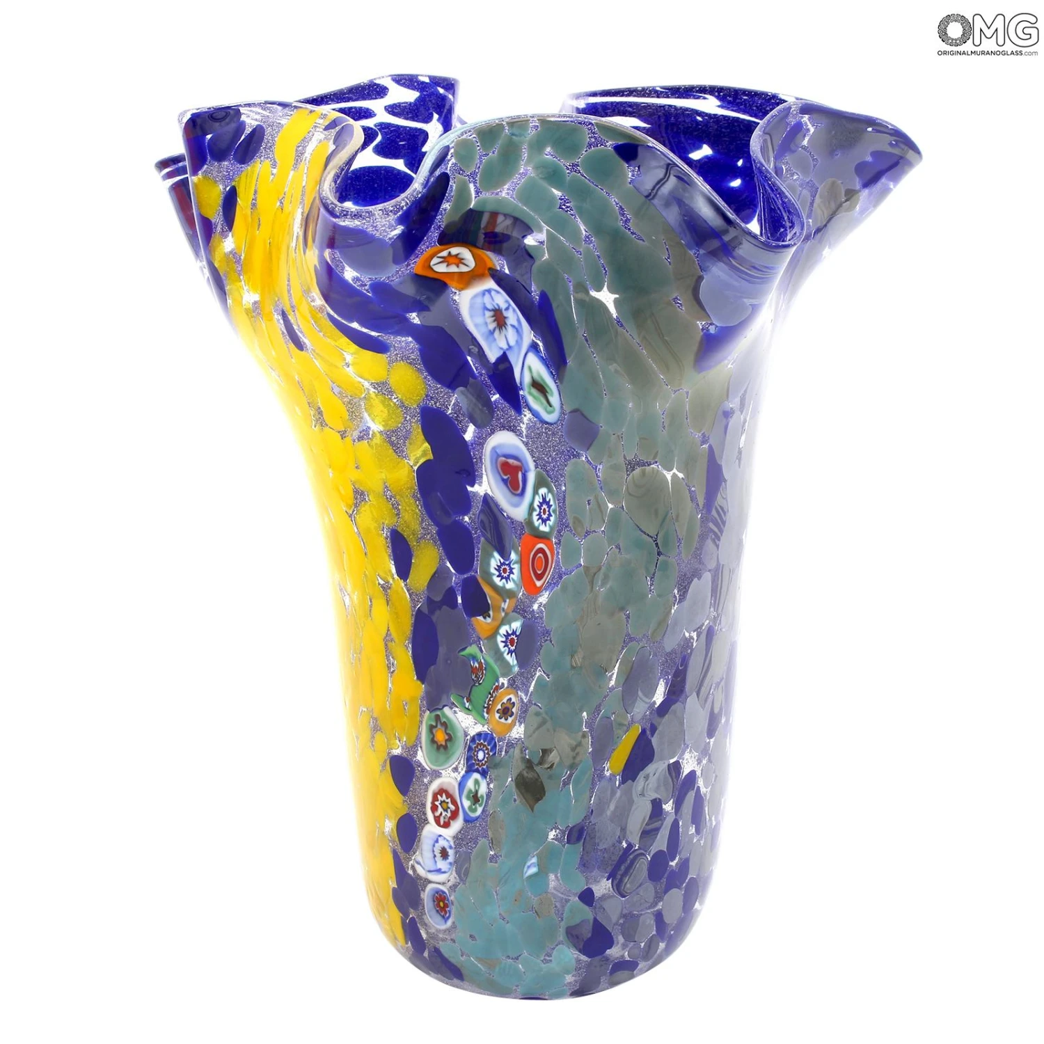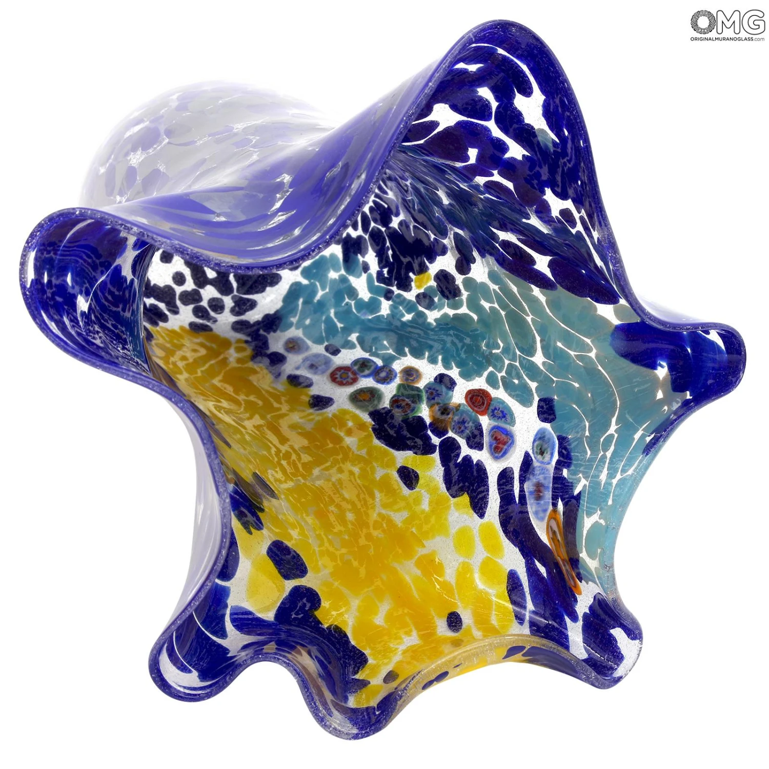 Bowl vase centerpiece in venetian glass handmade with the technique of glass blowing, with multicolored glass spots and millefiori decoration. This original Murano glass vase is signed by the glass master.