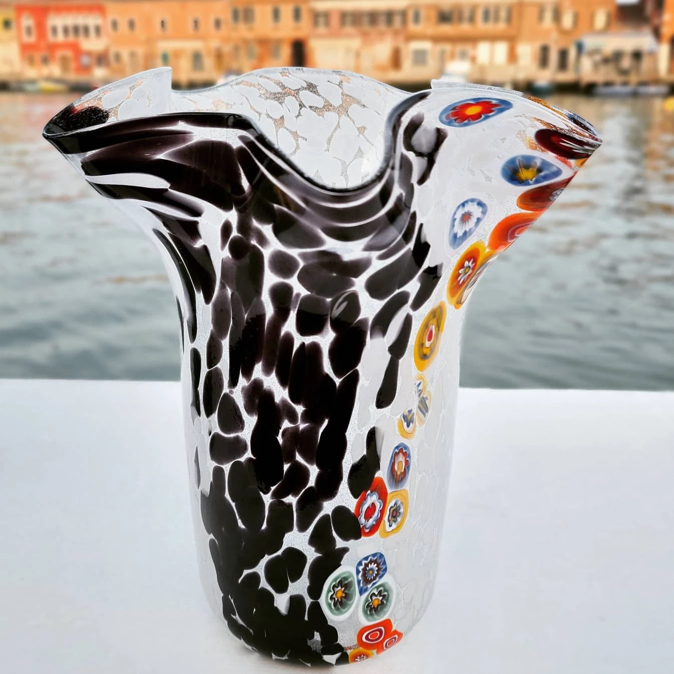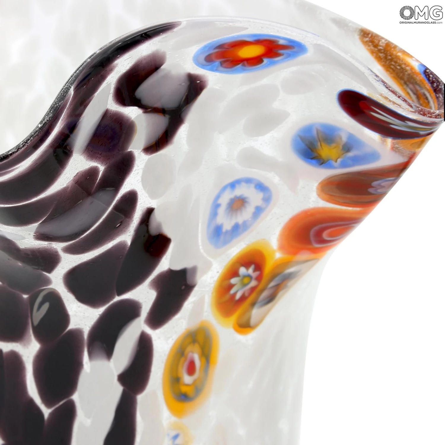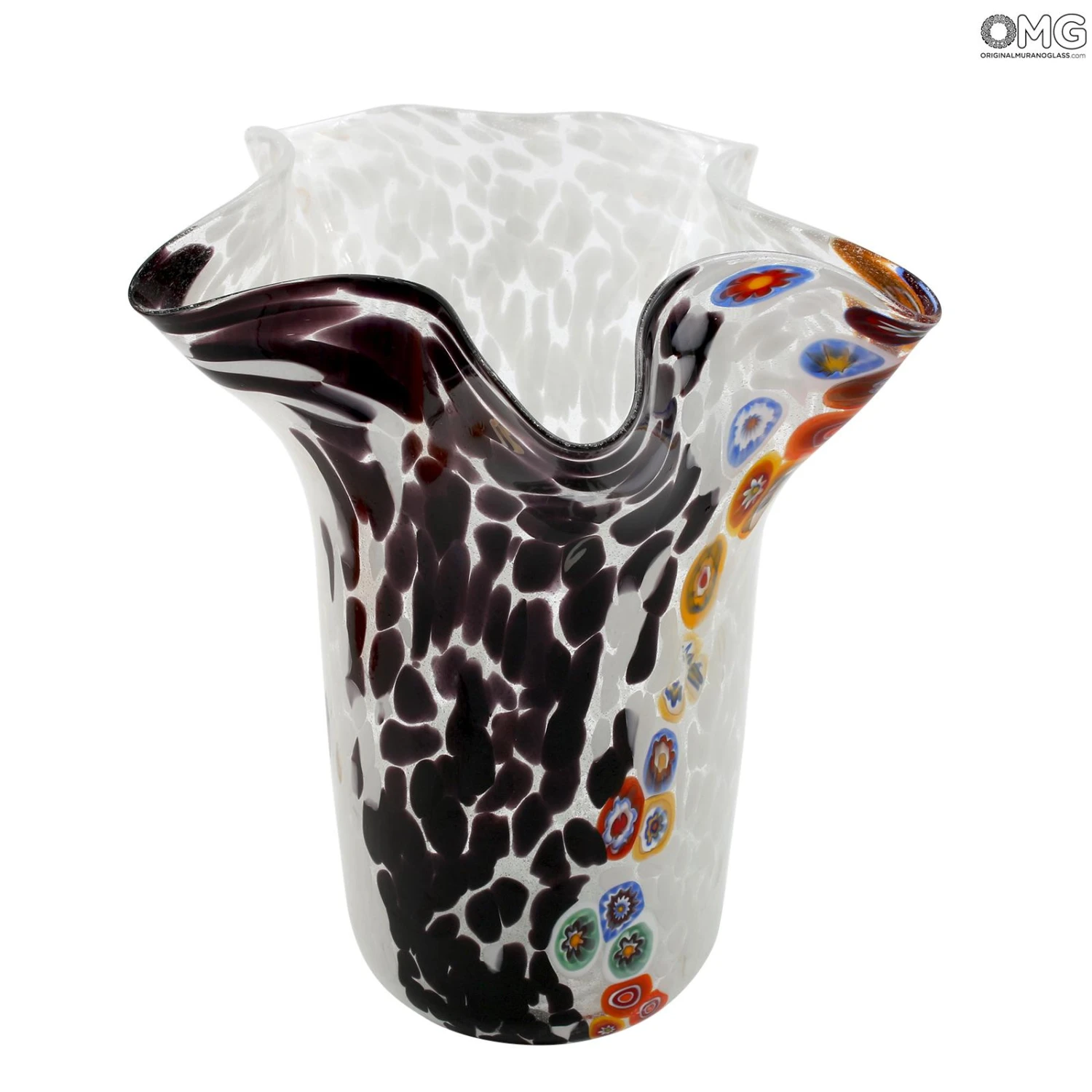 Bowl vase in venetian glass handmade with the technique of glass blowing, with multicolored glass spots and millefiori decoration. This original Murano glass vase is signed by the glass master.