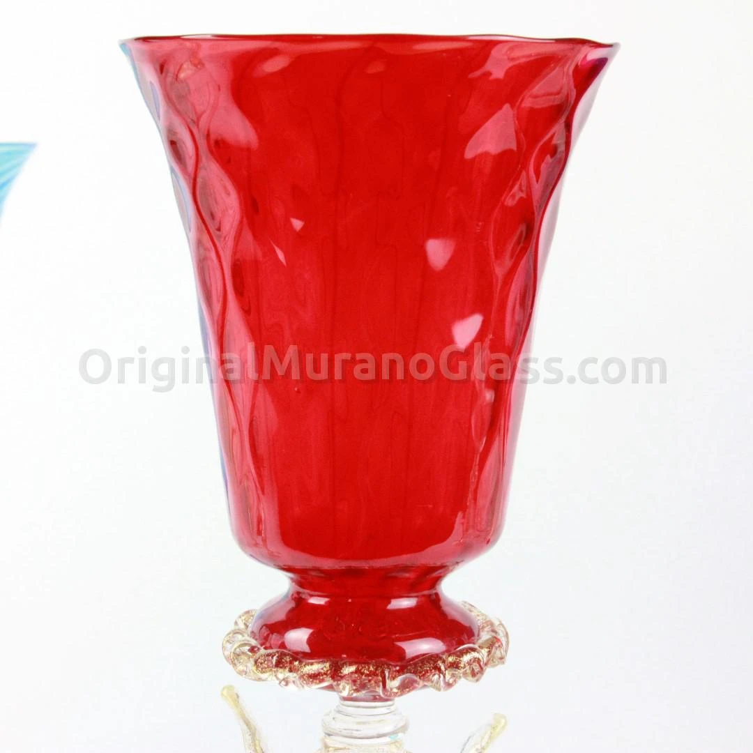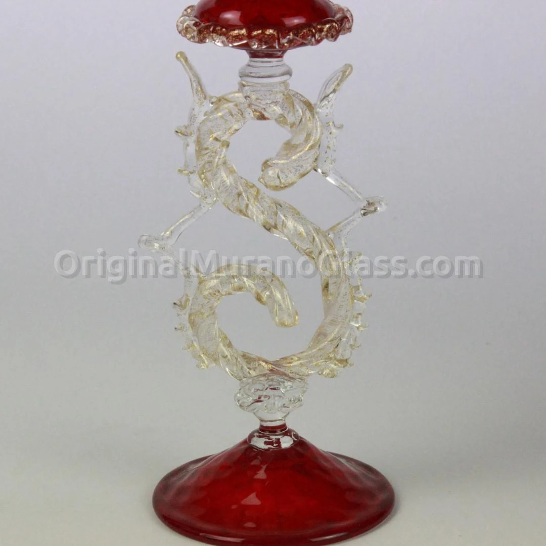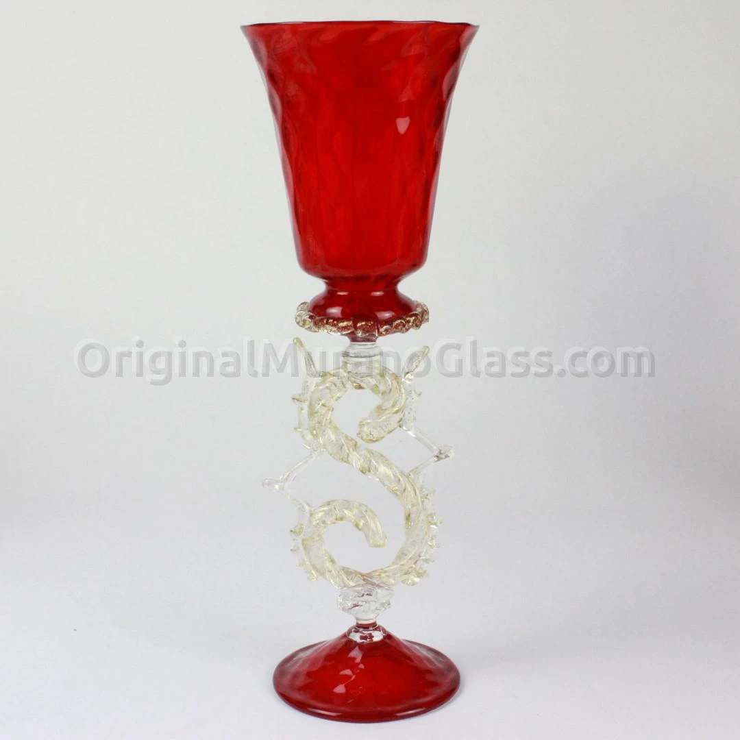 Blown glass goblet decorated with red glass. Gold leaf 24 kt in crystal glass S figurine made with the technique of worm glass modellation. Perfect details.