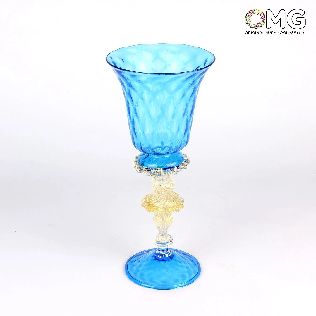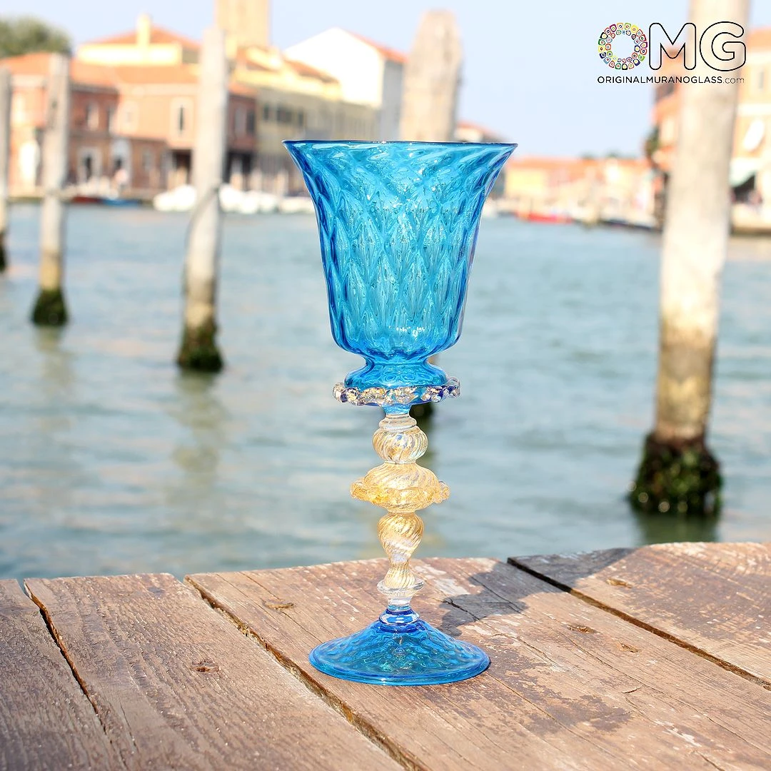 Blown glass goblet decorated with aquamarine glass. Gold leaf decoration in the stem. Perfect details. In the middle has a beautiful decoration Figure made with the tecnique of glass modellation