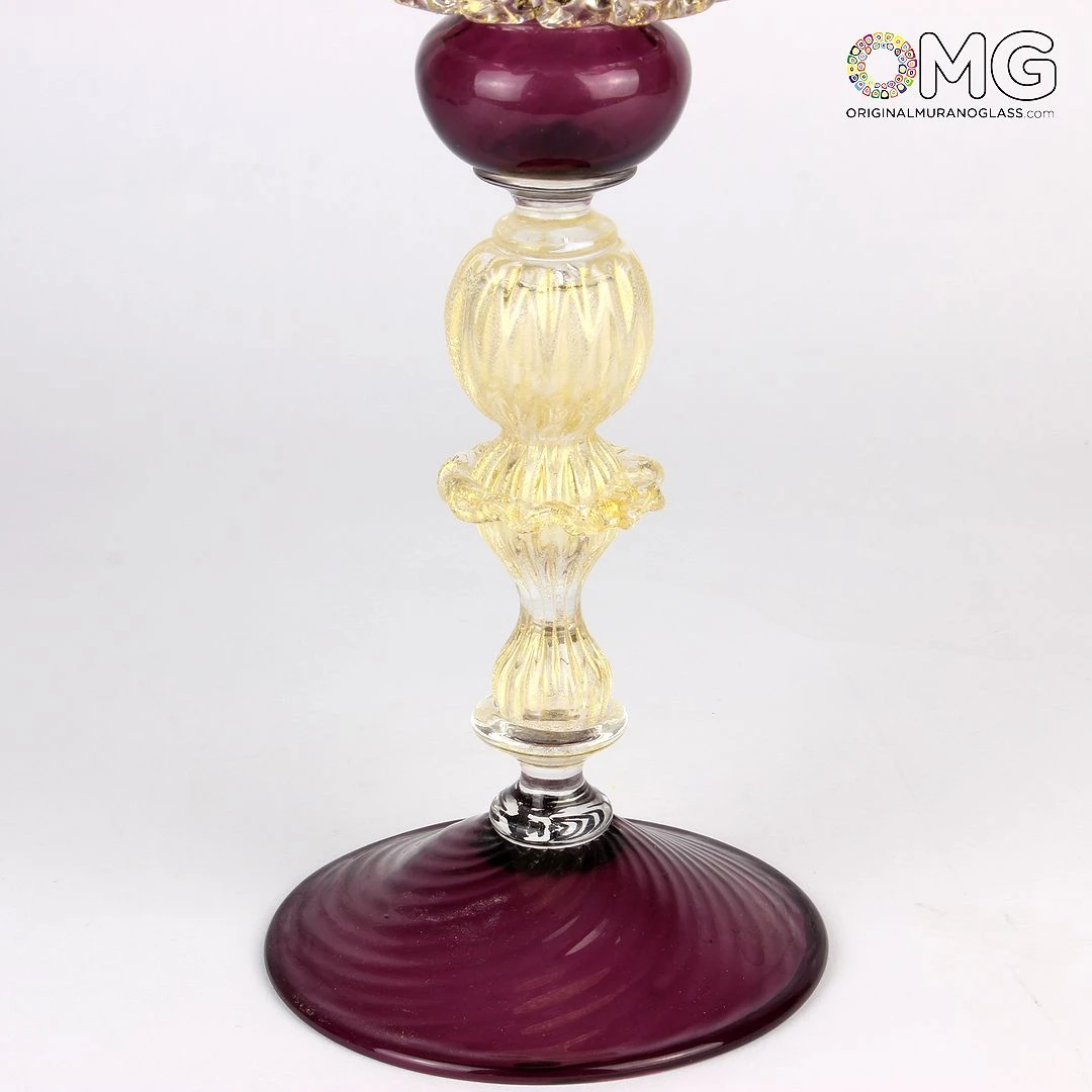 Blown glass goblet decorated with purple glass. Gold leaf decoration in the stem. Perfect details.