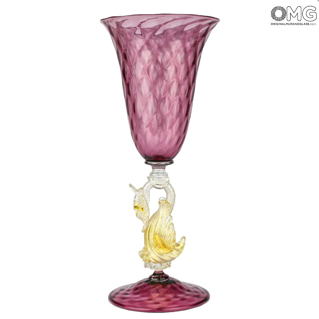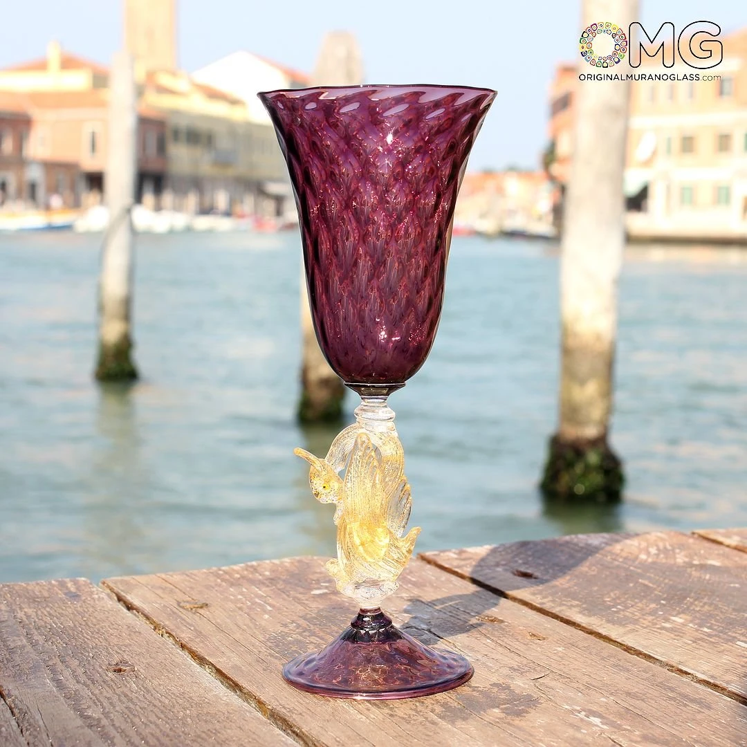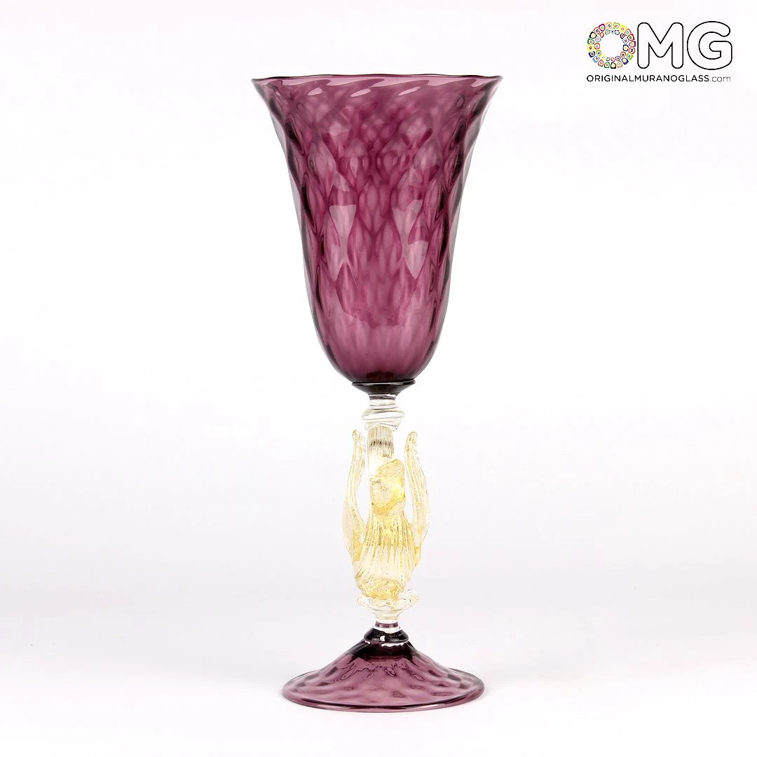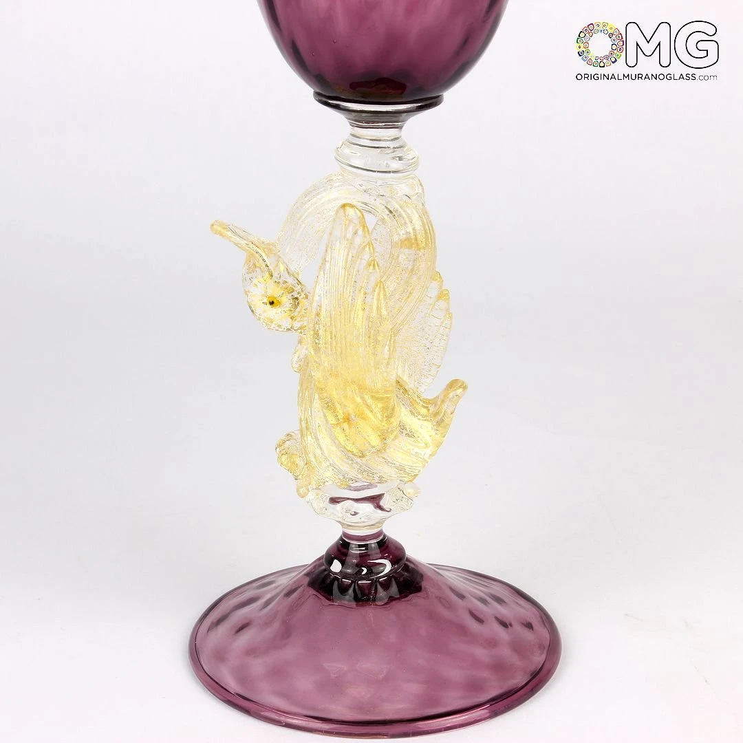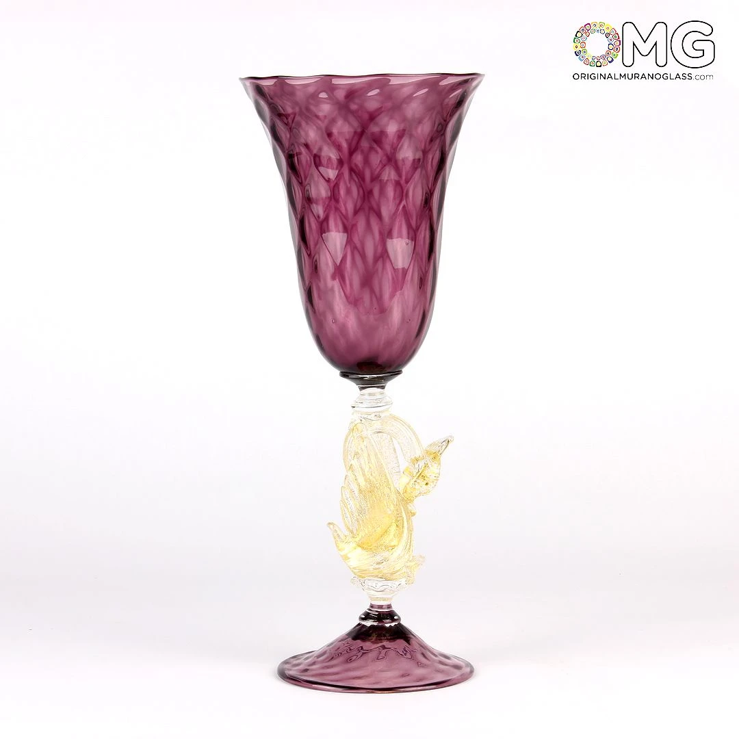Blown glass goblet with purple Murano glass. In the stem there is a Figurine of a swan, handmade with the tecnique of glass modellation in glass and gold 24carats, perfect details.