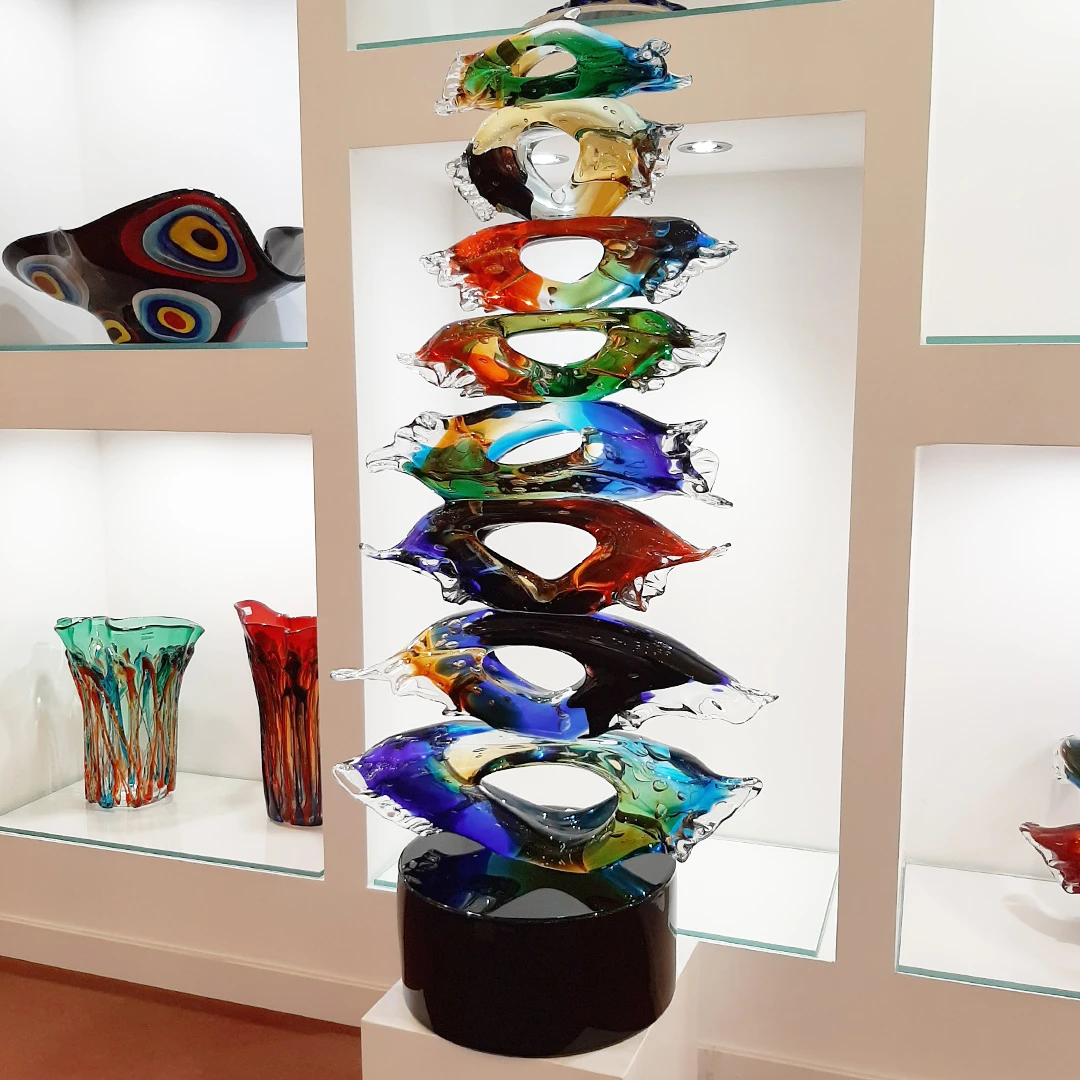 All the tradition of authentic Murano glass processing enclosed in an exclusive artistic work with a strong scenic impact, ideal to embellish the best interiors and luxury environments, such as houses, buildings, hotel halls, offices and exhibition spaces.