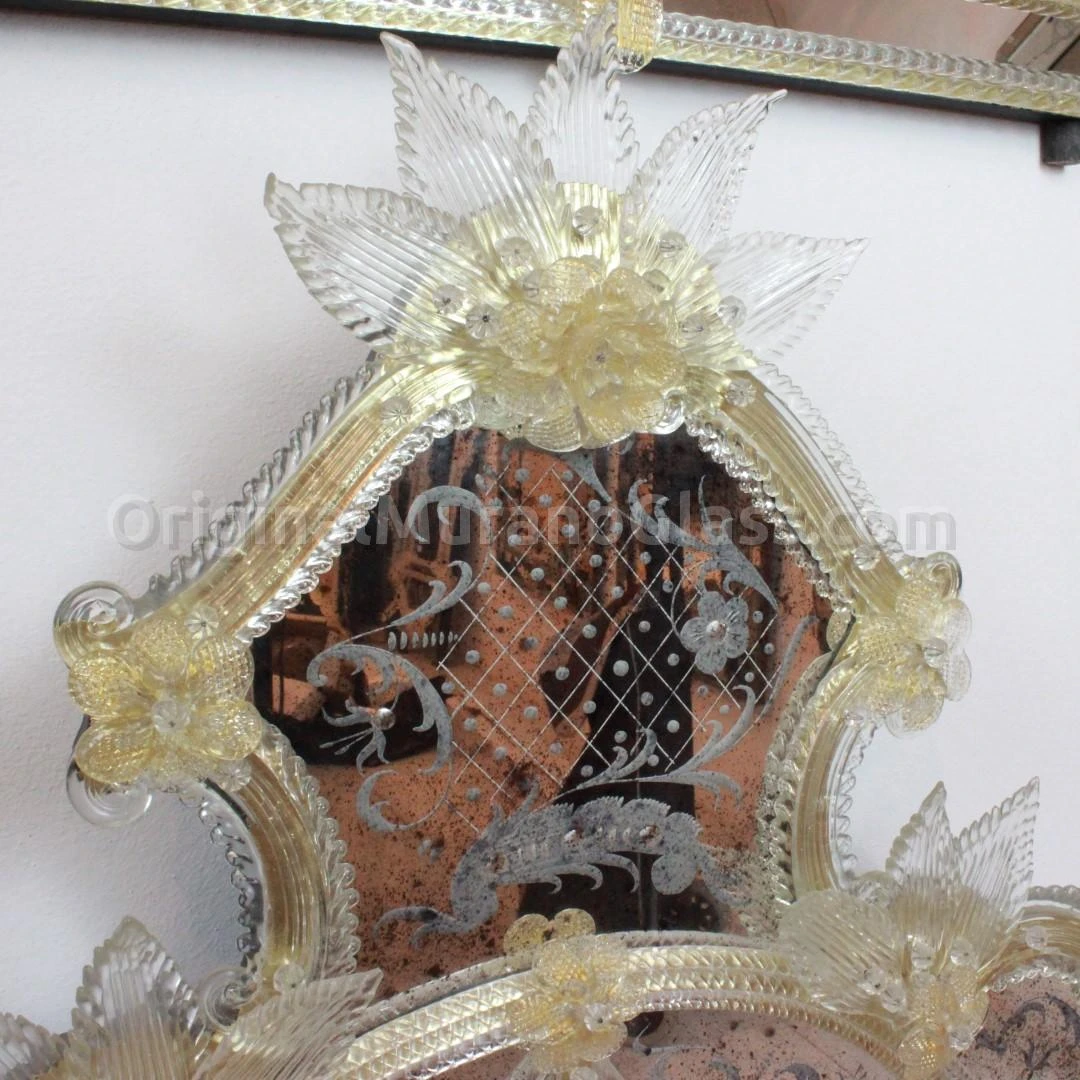 The mirror consists of 13 flowers and canes curls, with glass fused with 24kt gold, and wooden frame.